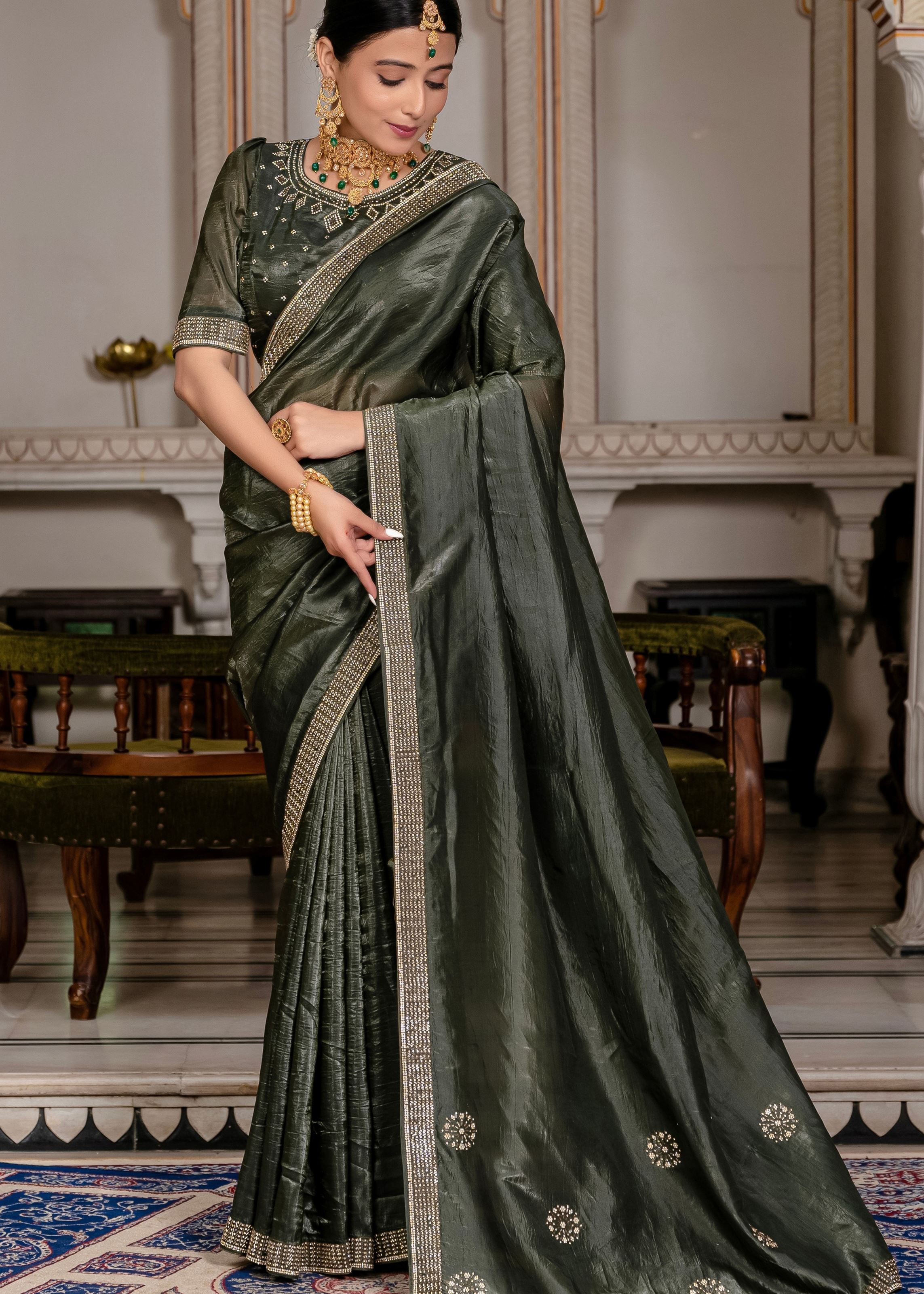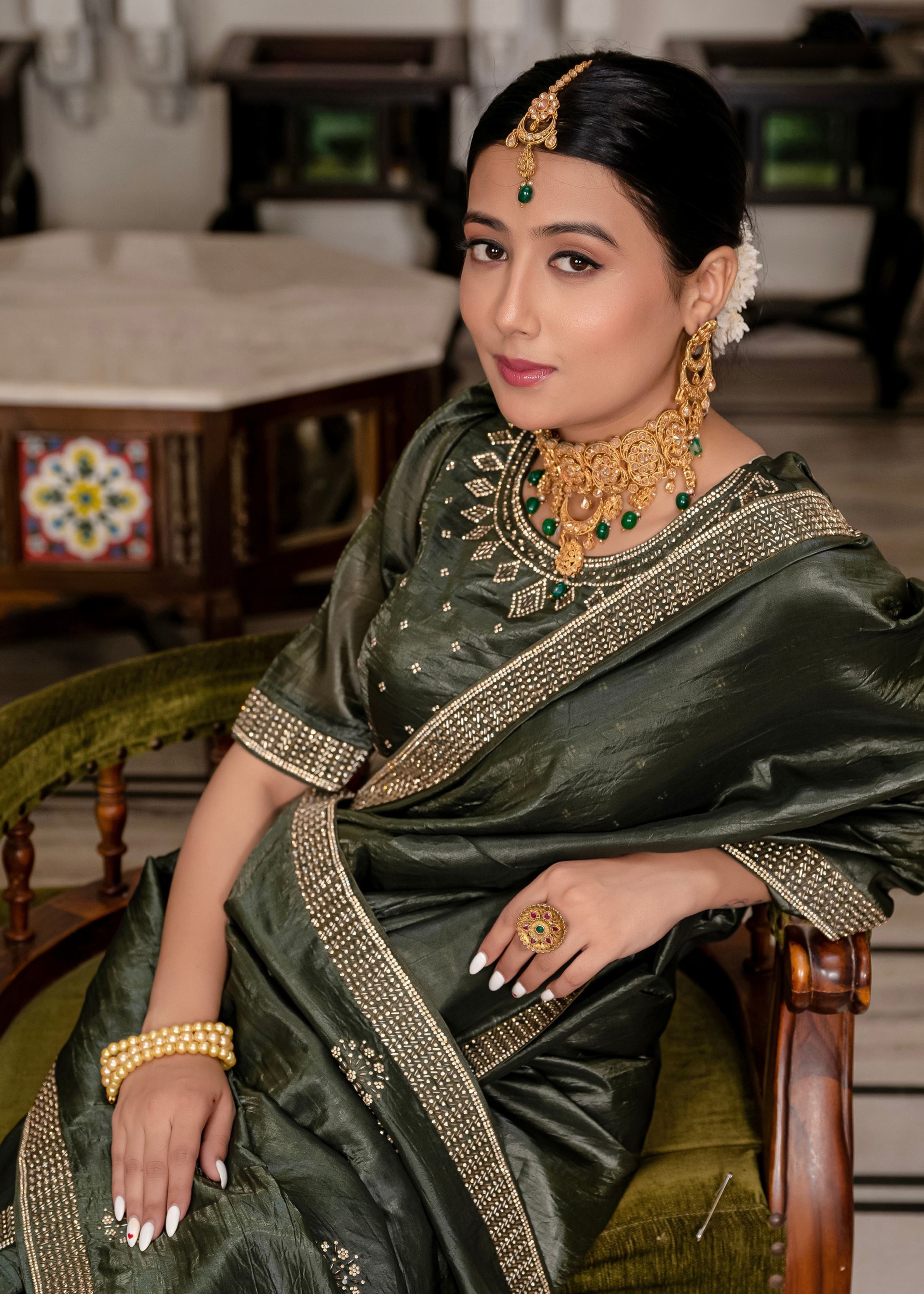 Embellished with intricate cutdana and zarkan work, the saree sparkles with hand-placed detailing that brings a sense of celebration and finesse. The artistry creates elegant patterns that enhance the fabric’s grandeur without overpowering its natural texture. A matching dark green blouse in gold crush fabric completes the outfit, maintaining a cohesive and luxurious silhouette.