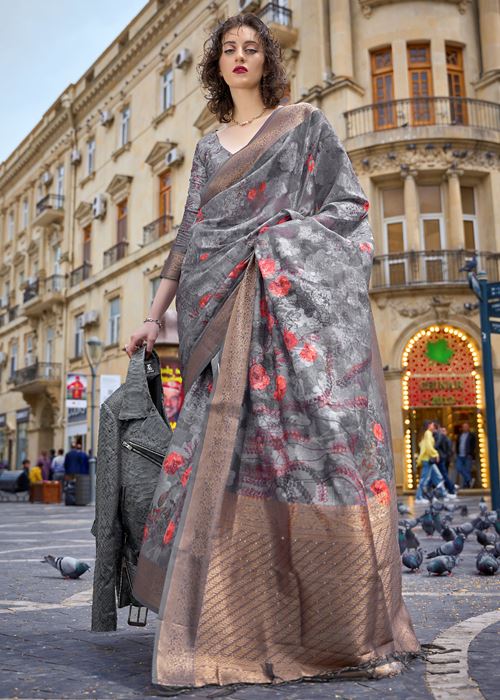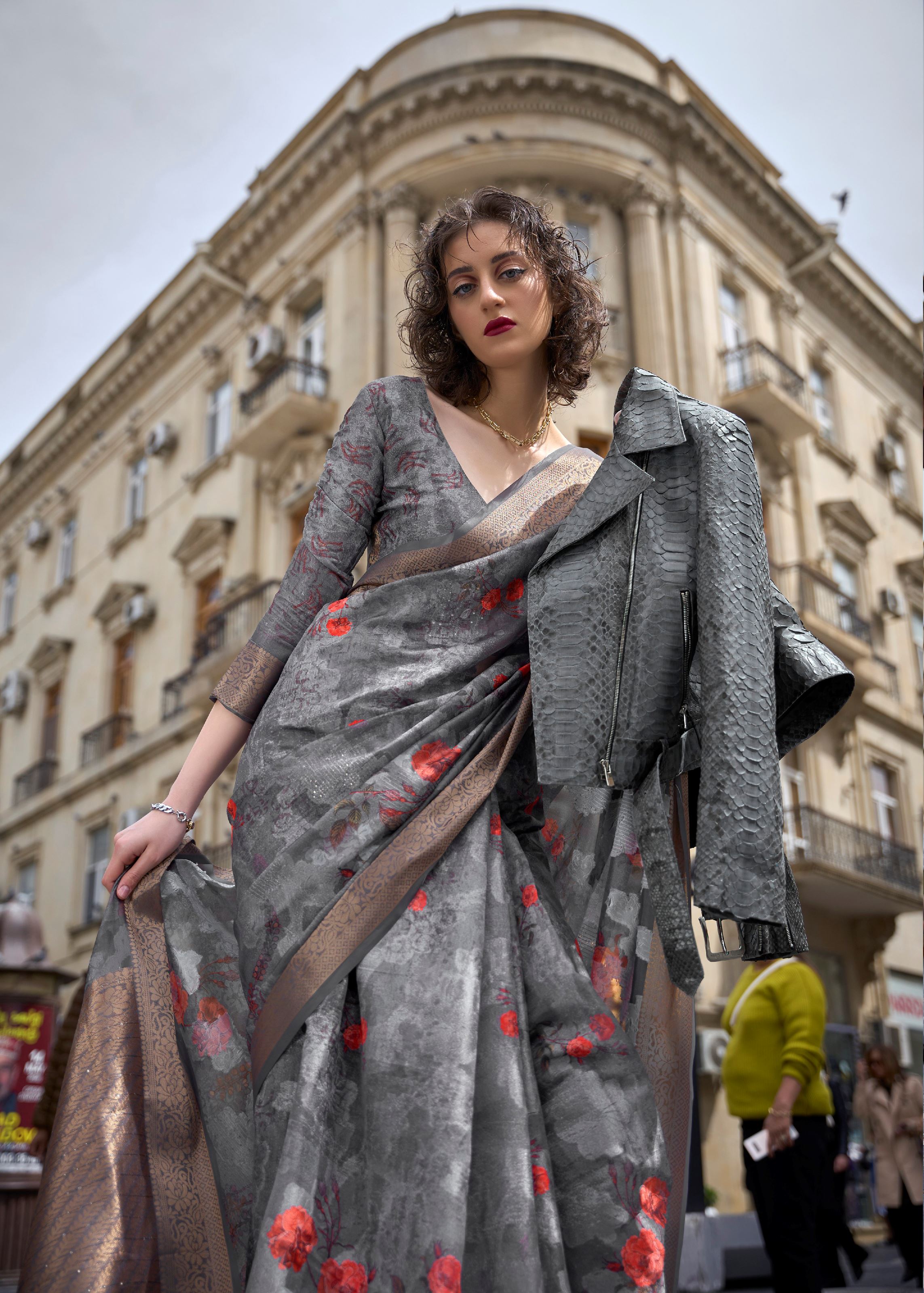 Dark Grey Poly Brasso Handloom Silk Saree With Printed Poly Brasso Handloom Waving