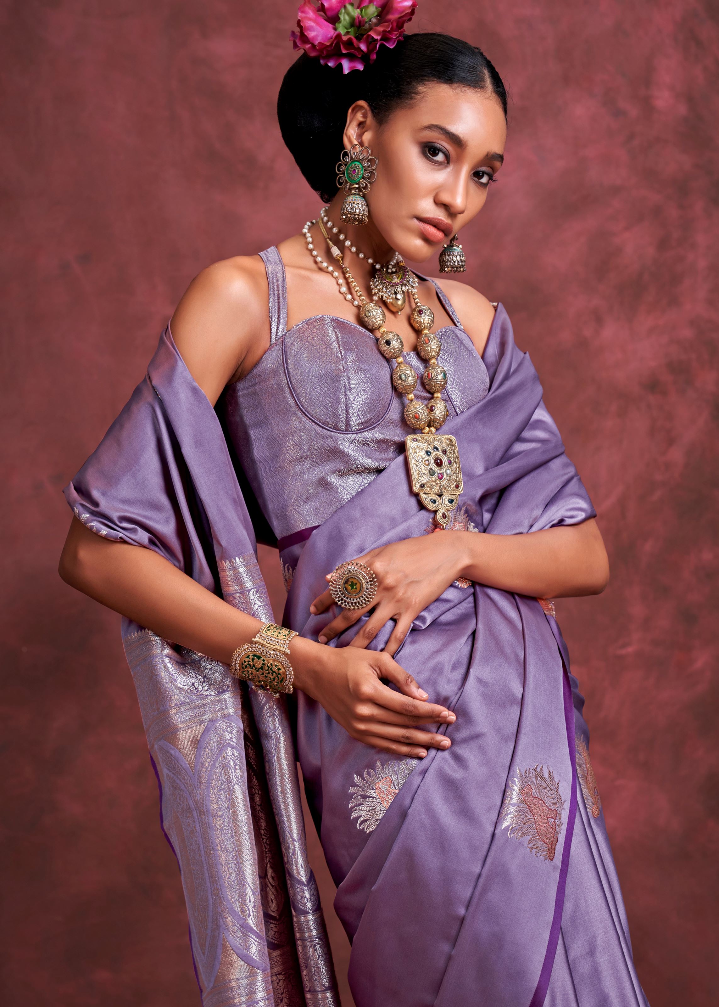 Accentuated with intricate jacquard woven work, both the saree and matching blouse create a seamless and refined ethnic look. The satin silk blouse in the same dark lavender shade ensures a harmonious ensemble, ideal for those who appreciate graceful detailing with a modern edge. This saree is perfect for styling with statement jewelry or minimalist accessories, depending on the occasion.