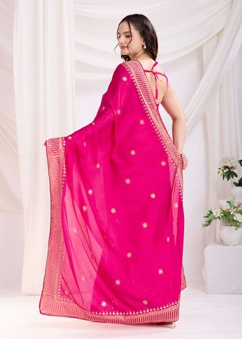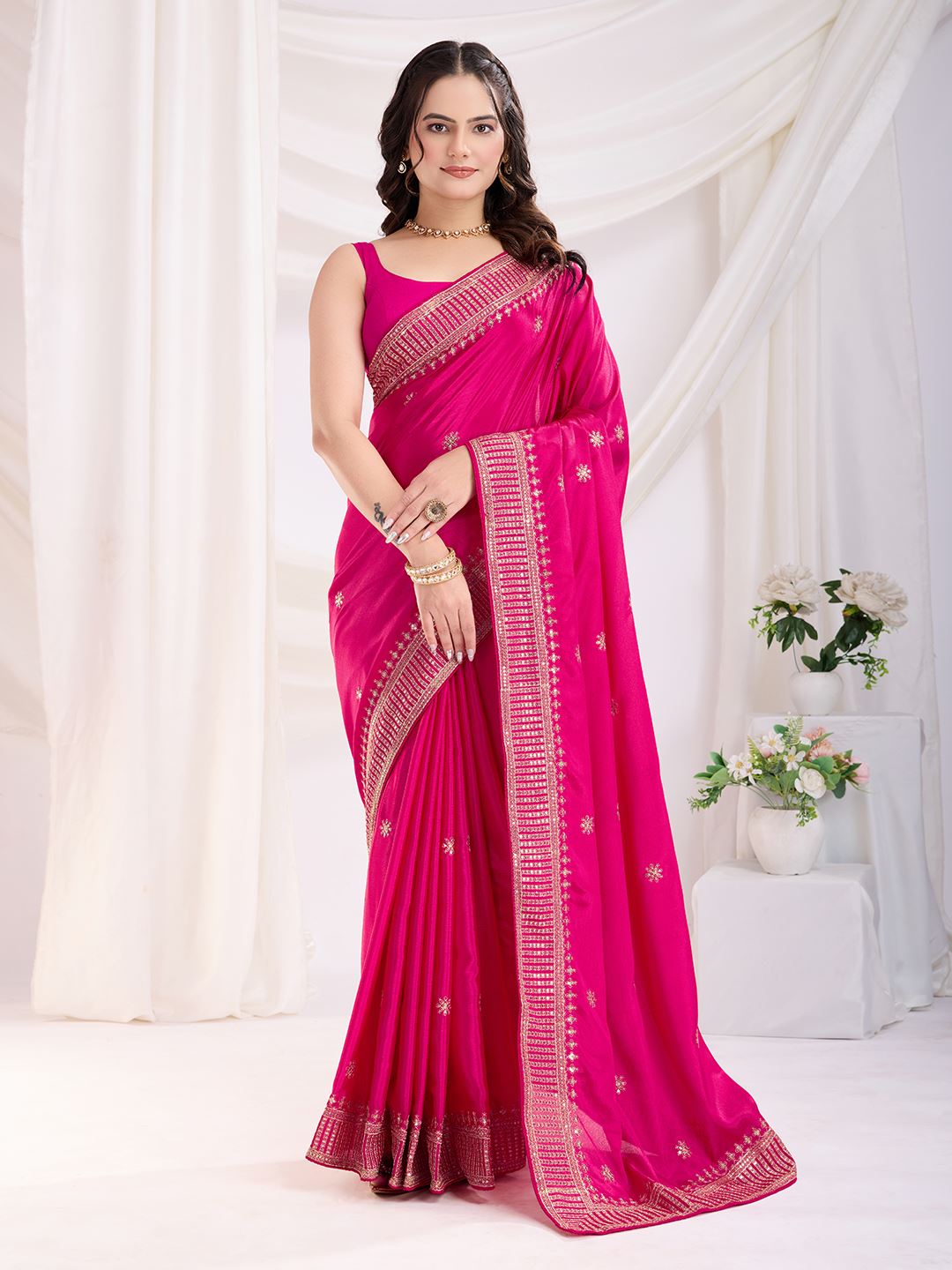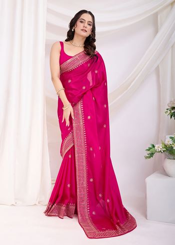 Dark Pink Chinon Silk Designer Zari Embroidered Ceremonial Saree