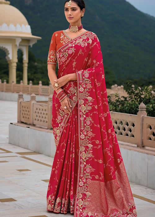 Dark Pink Silk Saree With Jacquard Woven and Embroidery Work