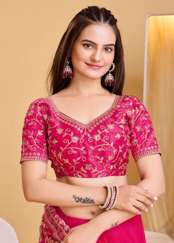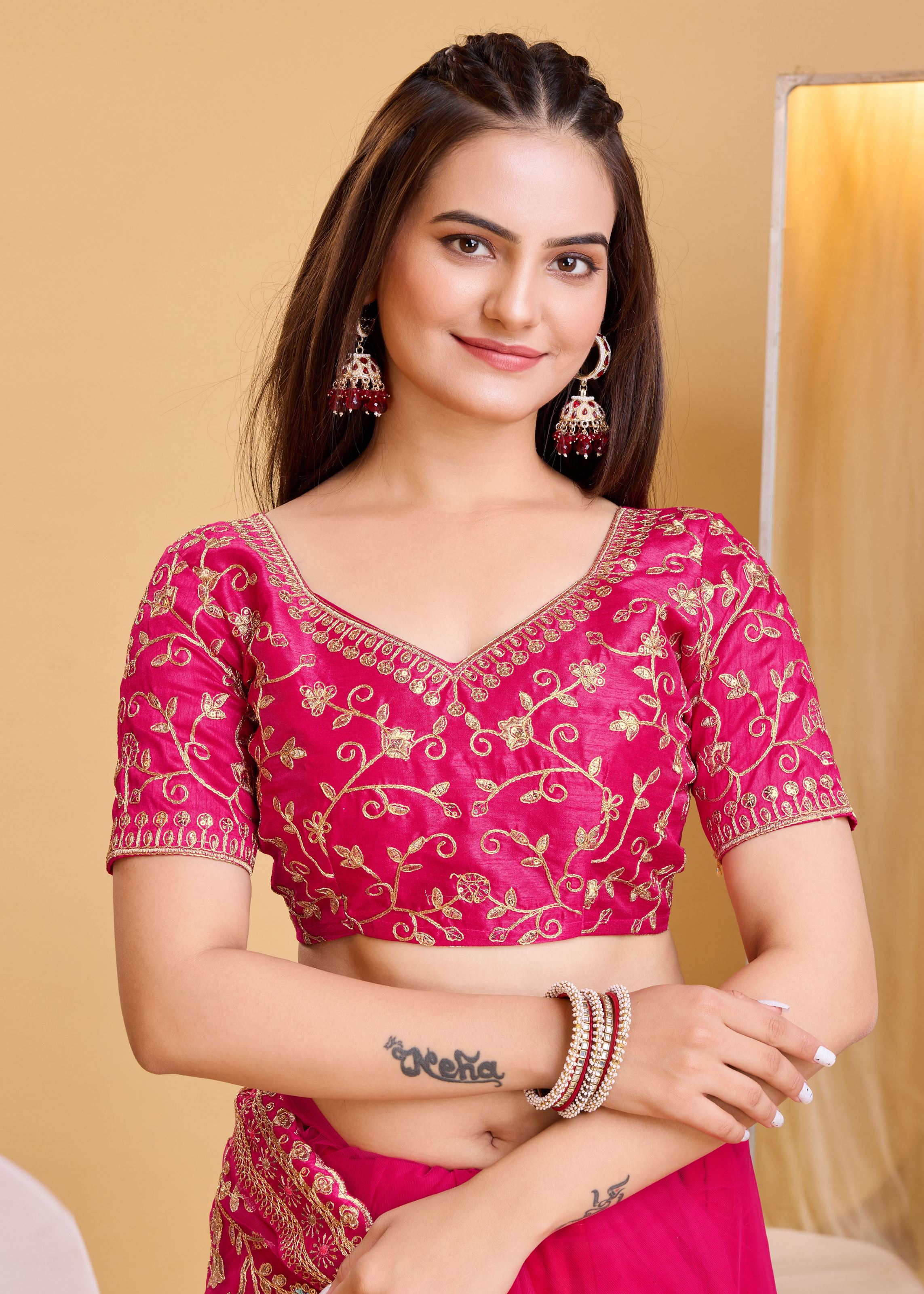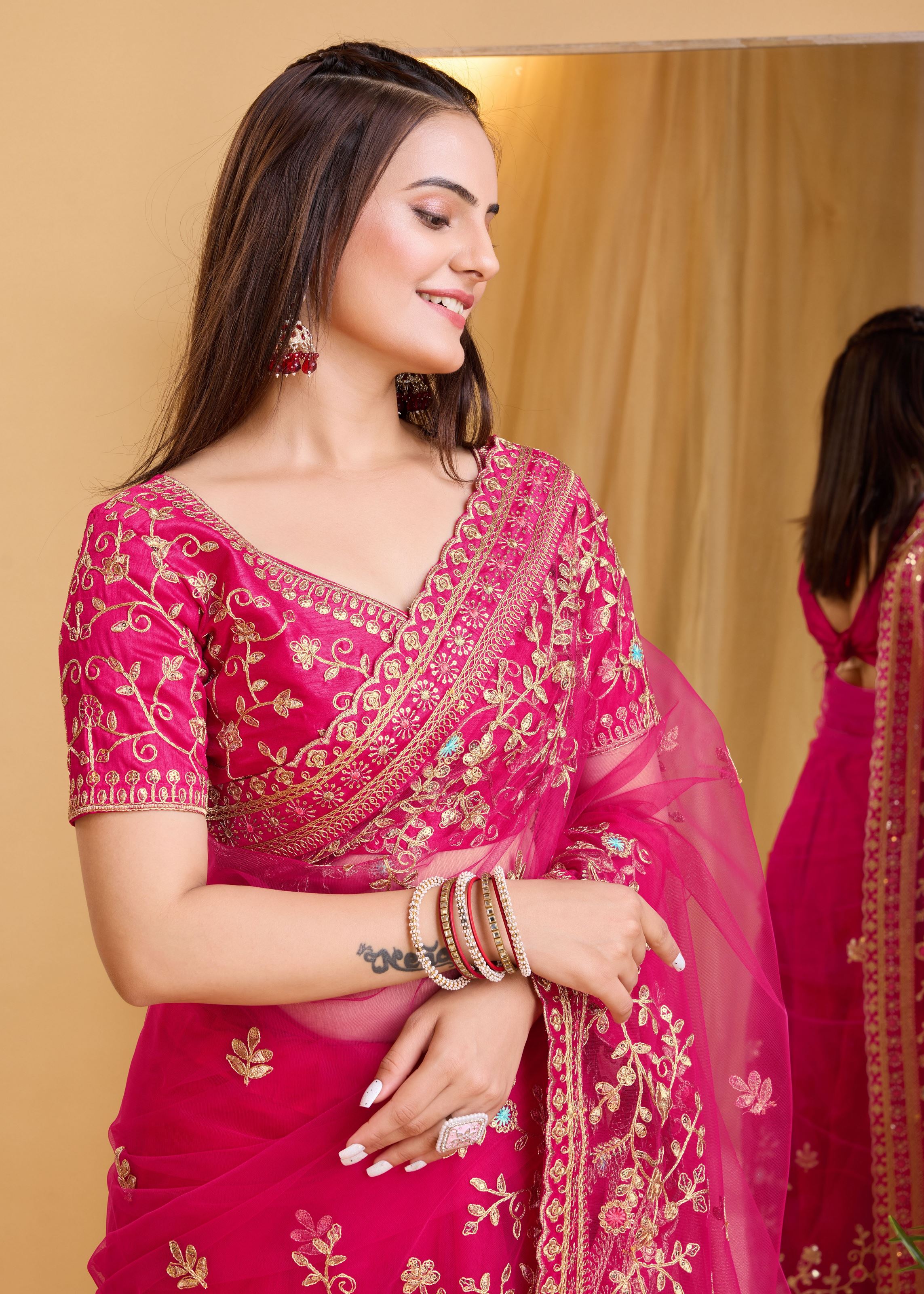 The rich dark pink shade symbolizes elegance and charm, making it an excellent choice for festive occasions and special events. Adorned with intricate embroidery work, this saree captures the essence of traditional craftsmanship with a modern Bollywood-inspired twist. It comes with a matching dark pink net blouse, ensuring a harmonious and stylish ensemble.