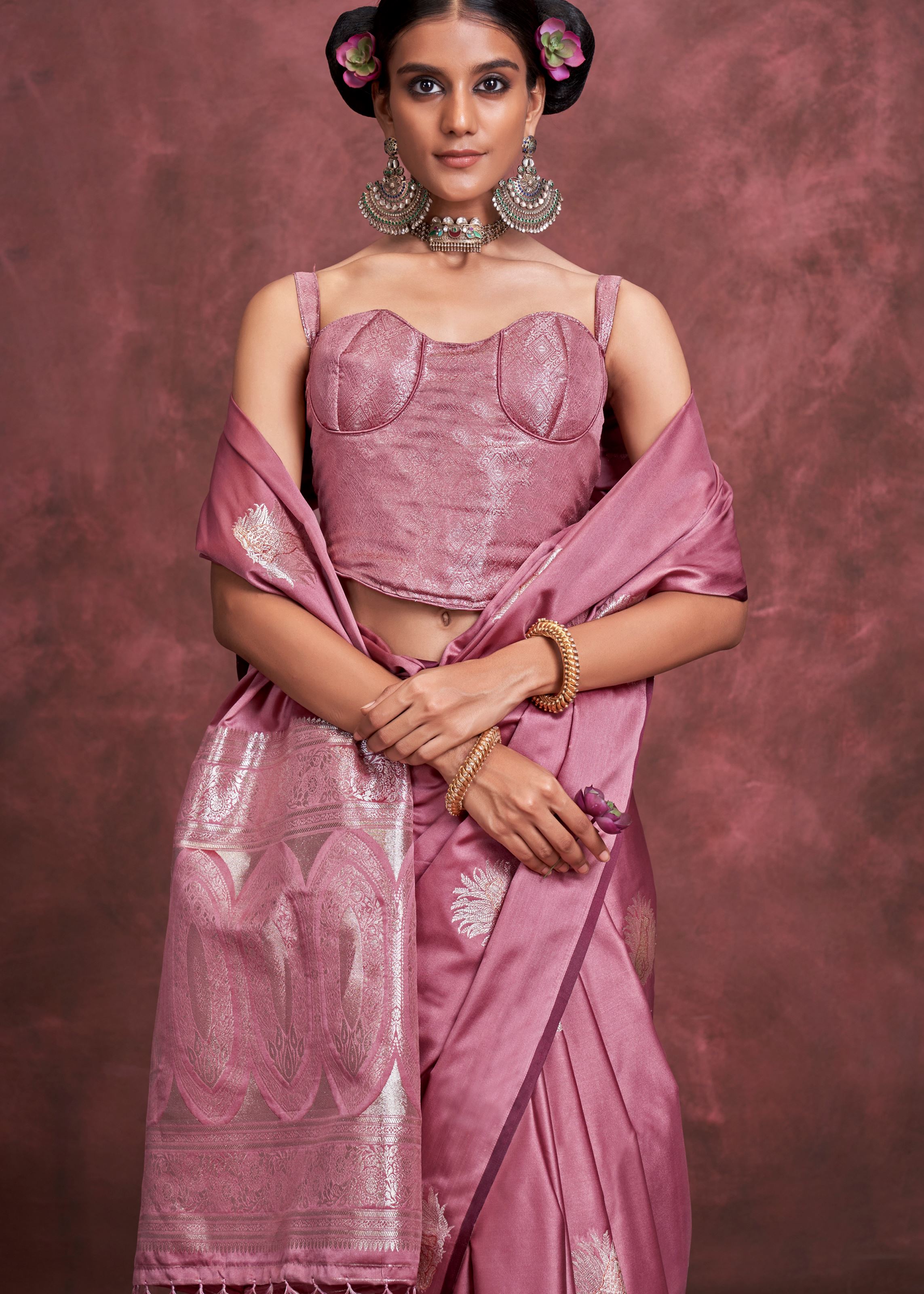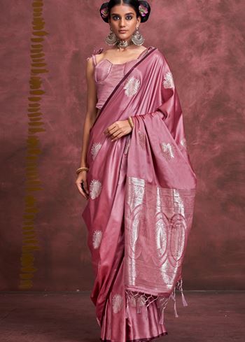 Adorned with detailed jacquard woven work, the saree features intricate patterns that subtly shimmer against the satin base. A matching satin silk blouse in the same dark rose tone completes the look, ensuring a cohesive and elegant ensemble. The artistry of the jacquard design elevates this saree into a statement piece without overwhelming its understated luxury.