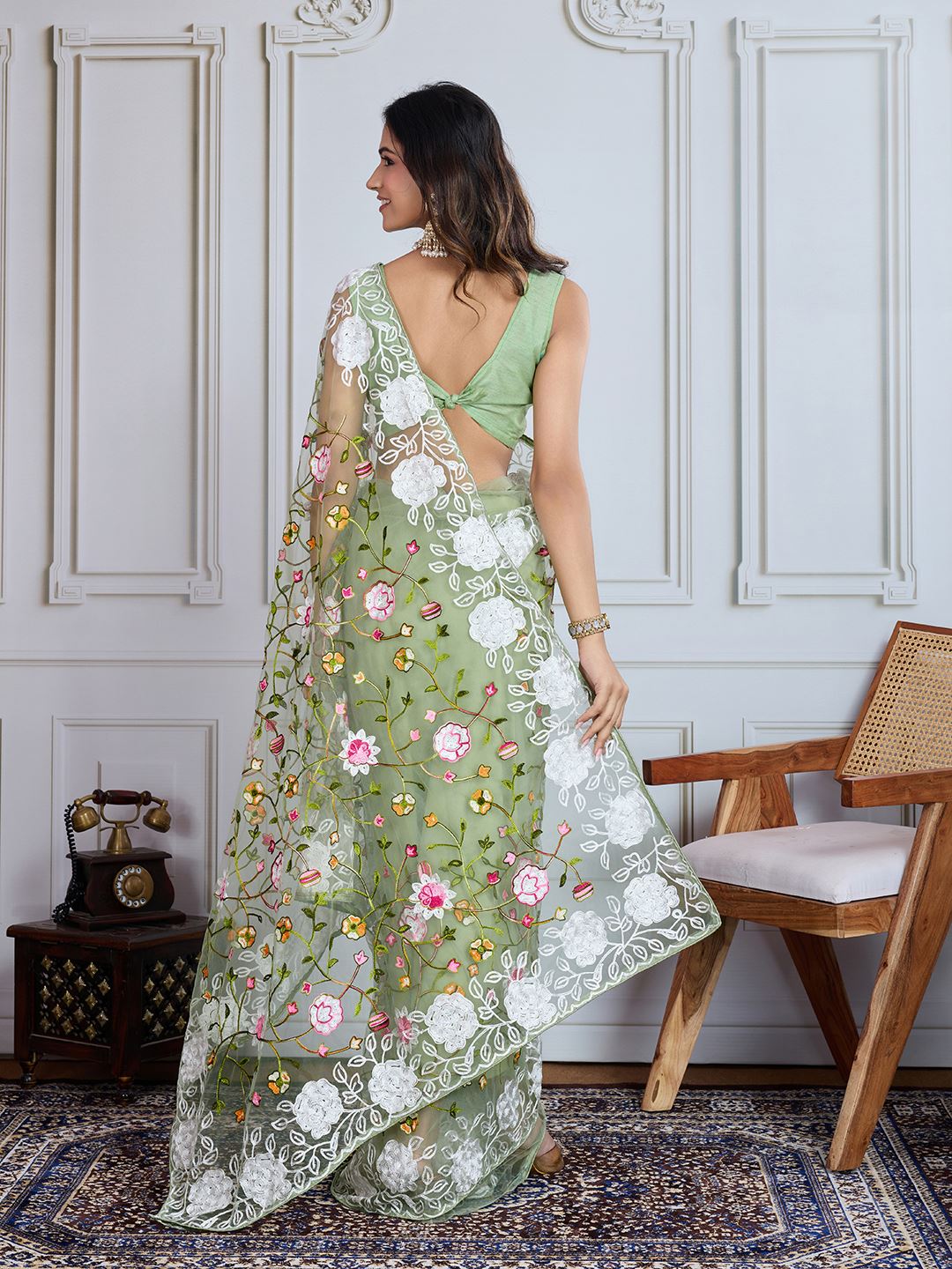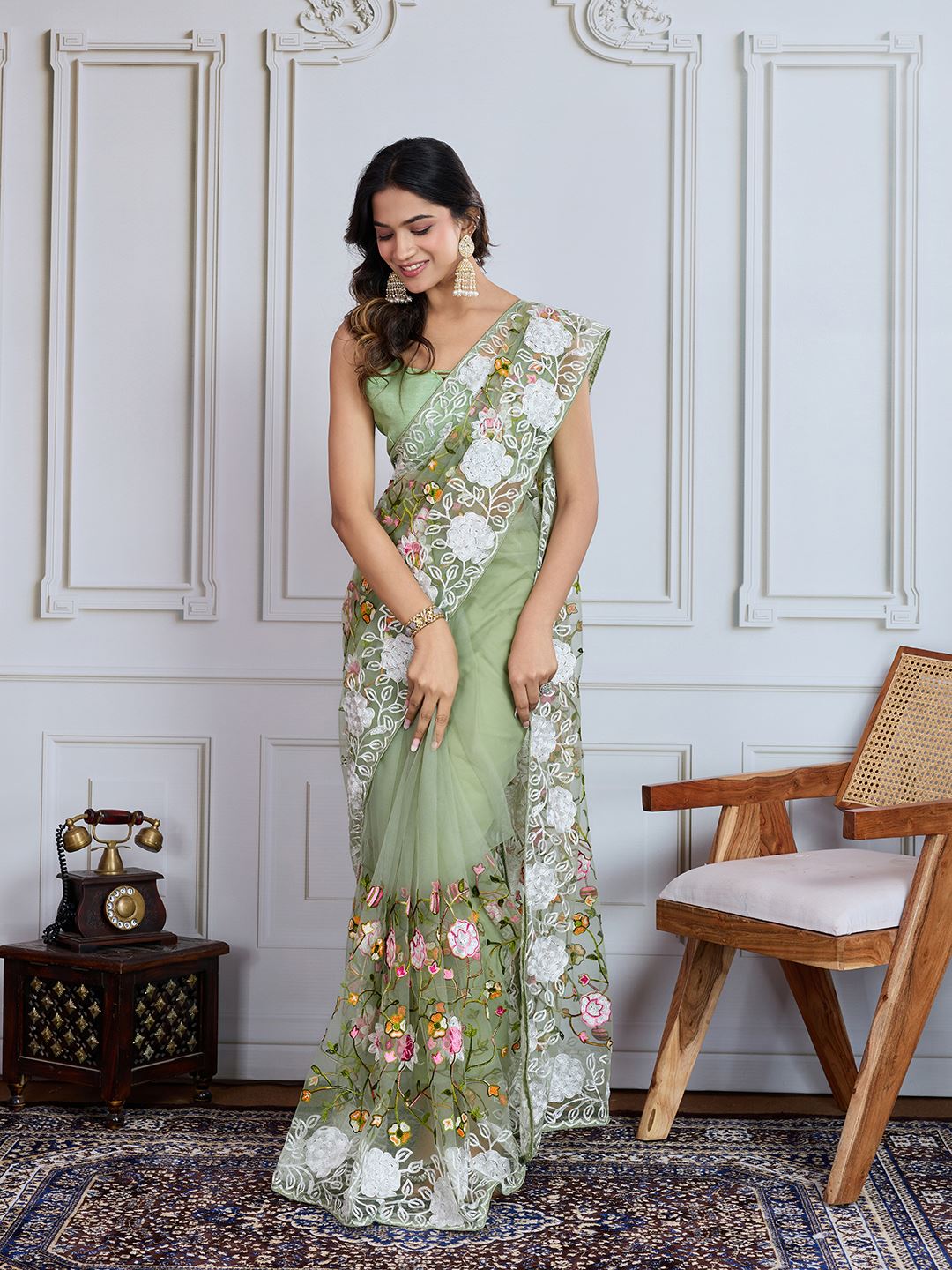 The soothing pista green base is beautifully paired with a matching art silk blouse, creating a harmonious and elegant ensemble. Its lightweight net fabric drapes effortlessly, highlighting the fine embroidery and providing a comfortable yet sophisticated look. Designed for women who appreciate traditional craftsmanship fused with contemporary style, this saree ensures you make a graceful and fashionable statement at any event.
