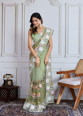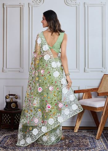 Designer Multy Thread Embroidery Work Pista Soft Net Saree For Wedding Looks