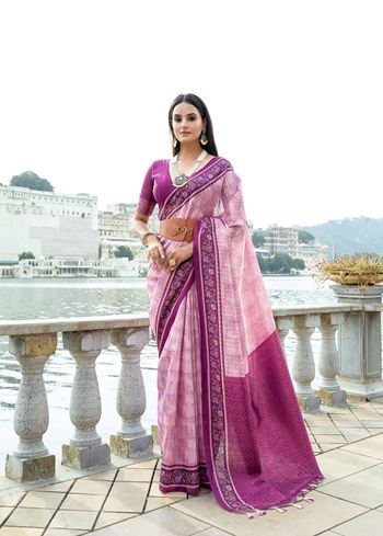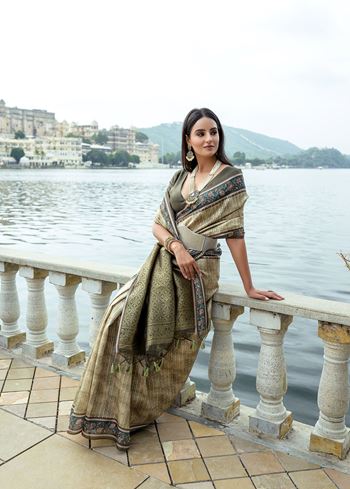 The soothing pista green base is enhanced with intricate woven designs and delicate print detailing, creating a subtle yet regal look. This versatile shade complements a wide range of jewelry styles, whether you prefer traditional gold, antique temple jewelry, or modern minimalist accessories. The saree comes with a matching green silk blend blouse piece, allowing you to tailor it to your desired style—be it a classic traditional blouse or a chic contemporary cut.
