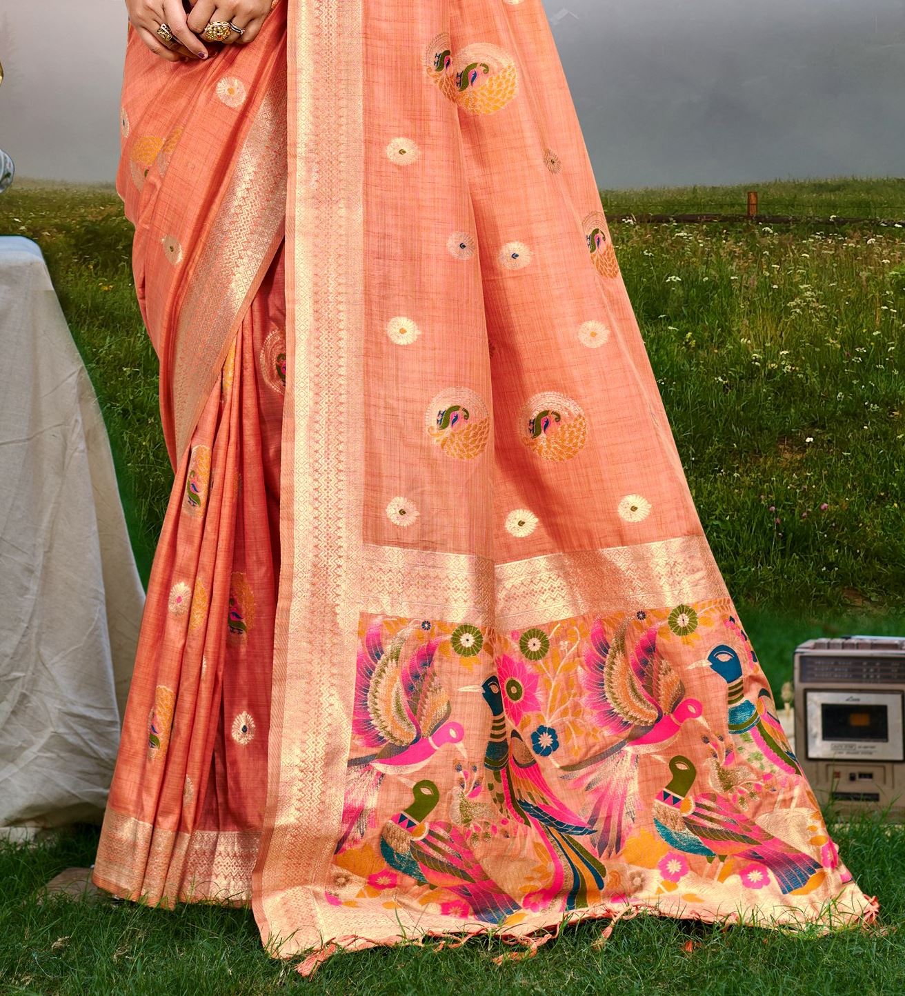 Featuring intricate Meenakari work, this saree reflects timeless craftsmanship, infusing a subtle regal charm into your ensemble. The matching gajri Assam silk blouse completes the look, creating a cohesive and polished outfit. Lightweight and breathable, the fabric ensures ease of wear while maintaining a graceful silhouette throughout your festivities.