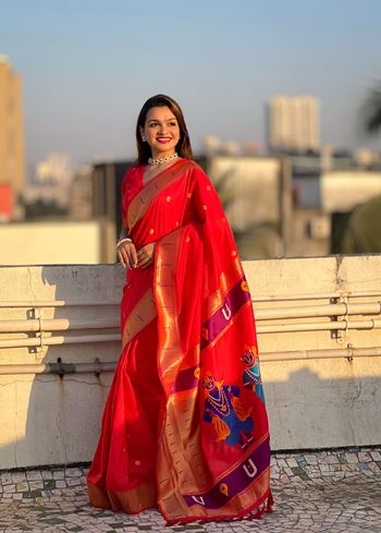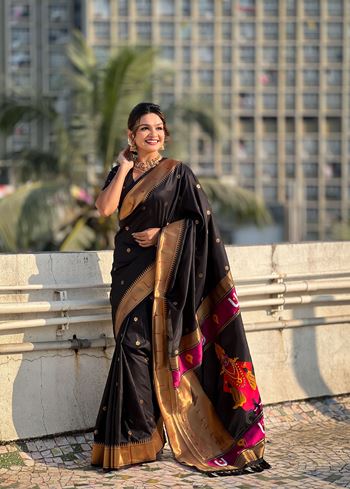 The matching navy blue silk blouse complements the saree beautifully, enhancing its regal appeal and creating a cohesive, elegant look. The detailed woven patterns highlight expert craftsmanship, merging traditional Paithani artistry with contemporary designer aesthetics. Lightweight yet rich in texture, this saree ensures comfort while making a statement at every celebration.