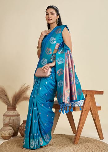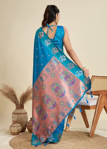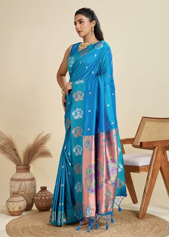 The true showstopper is the exquisitely woven Paithani-inspired pallu, featuring traditional floral and peacock elements in zari, creating a captivating contrast against the cool, refreshing body. The coordinated firozi blouse in Banarasi silk ensures a seamless and polished look, ideal for festive celebrations, day weddings, or intimate gatherings.