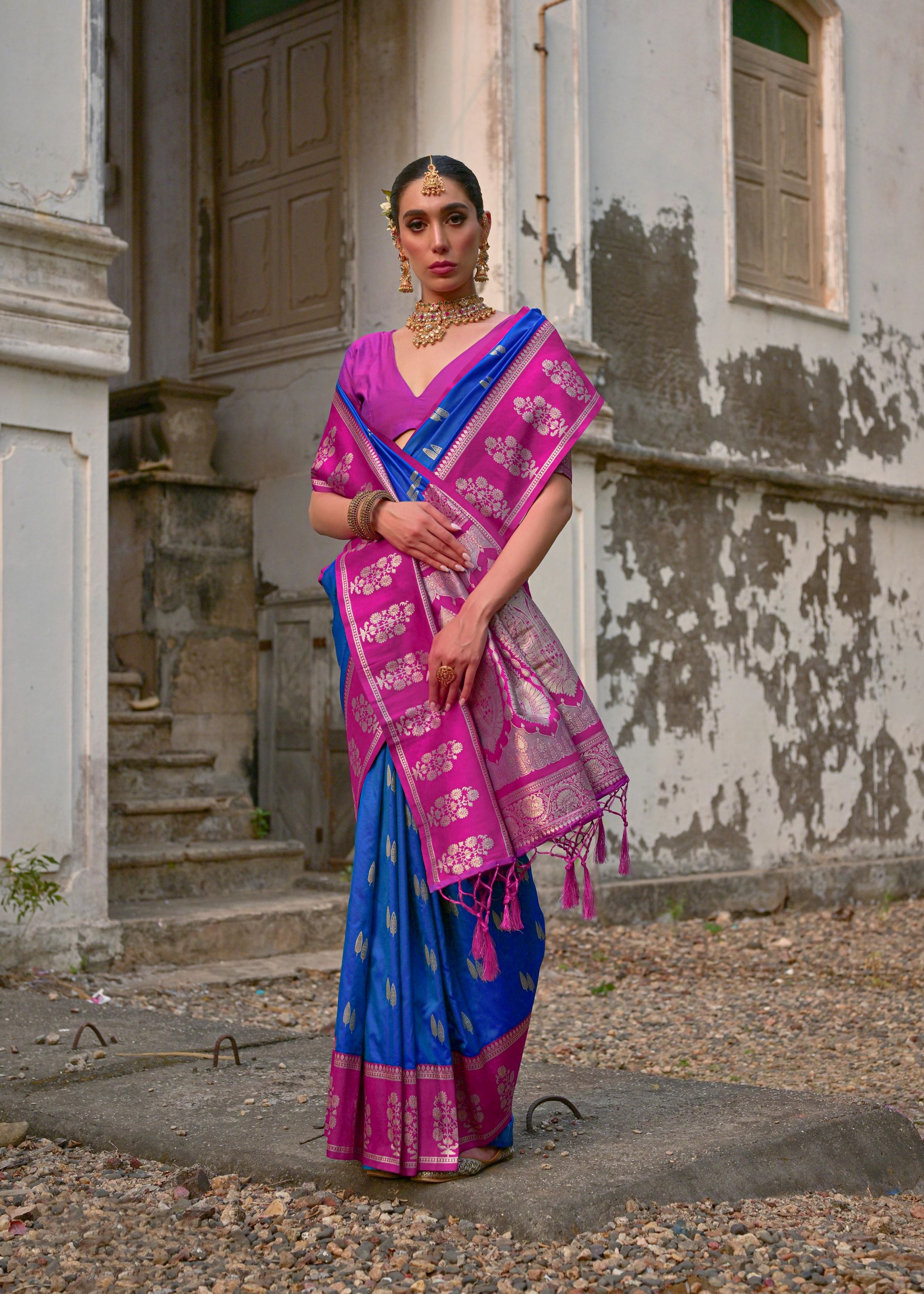 The vibrant firozi blue shade symbolizes grace and royalty, making it a perfect pick for occasions where you want to stand out. Enhanced with intricate zari woven motifs, the saree exudes grandeur with its shimmering finish. Each woven detail reflects fine craftsmanship, giving the saree a heavy ceremonial appeal while retaining its elegance and refinement.