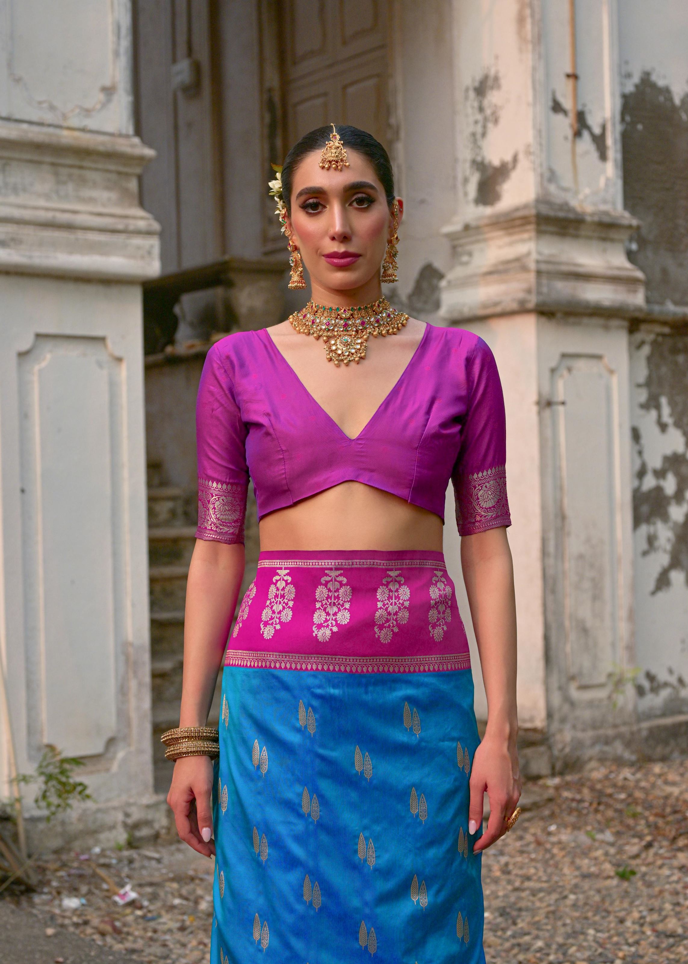 Bring regal elegance to your festive collection with the Firozi Banarasi Silk Woven Jari Designer Saree, a stunning piece that highlights the richness of Banaras weaving heritage. Crafted from a luxurious silk blend fabric, this saree drapes beautifully, offering both comfort and sophistication for weddings, receptions, and cultural ceremonies.
