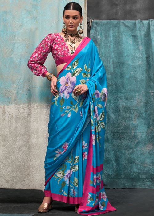 Make a statement with modern grace in our Firozi Crepe Saree With Digital Print, brought to you by Aethnofit Fashions. This saree features a stunning firozi (turquoise) tone, digitally printed with contemporary floral designs, and crafted in fluid crepe fabric for a sleek, elegant drape.