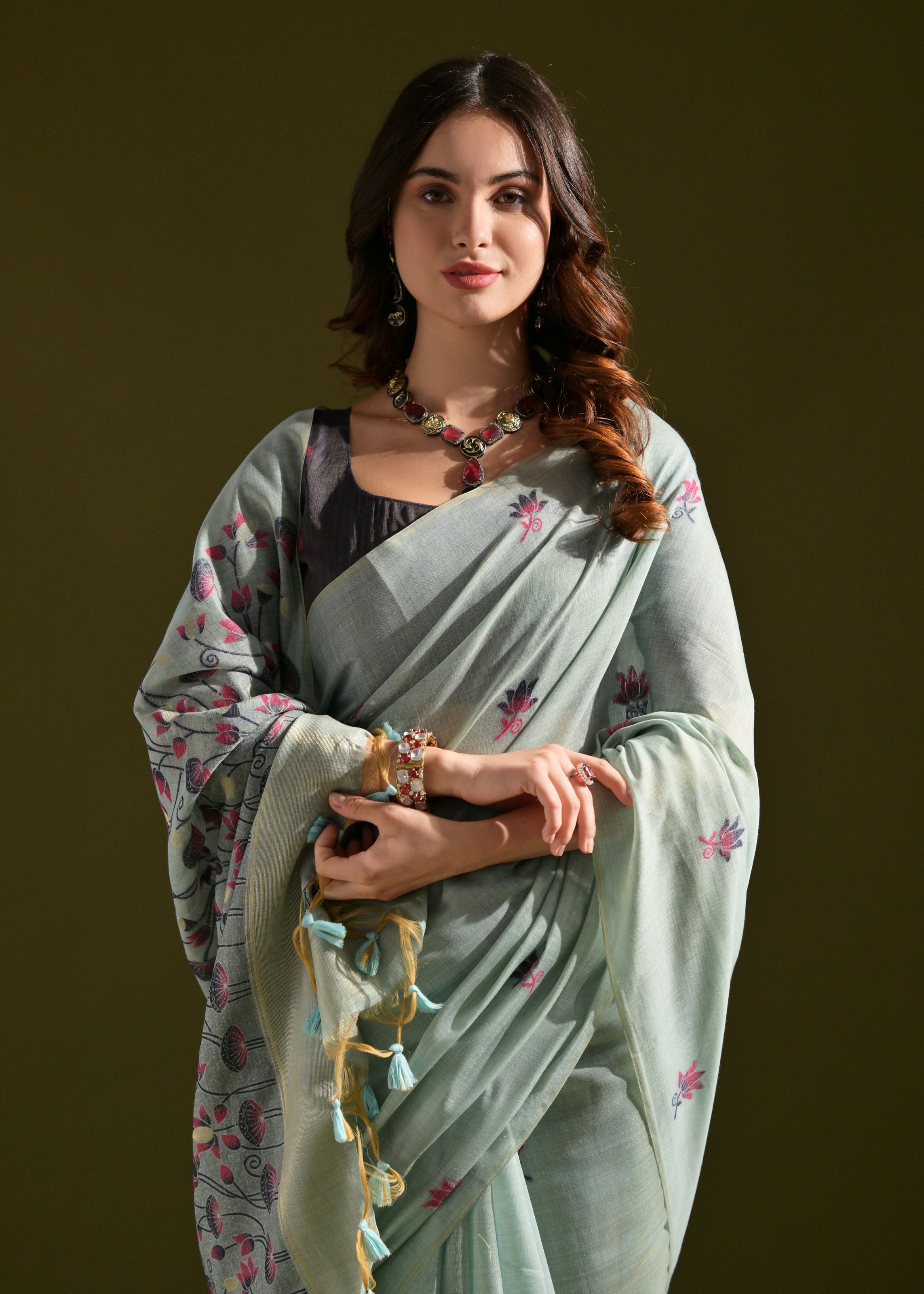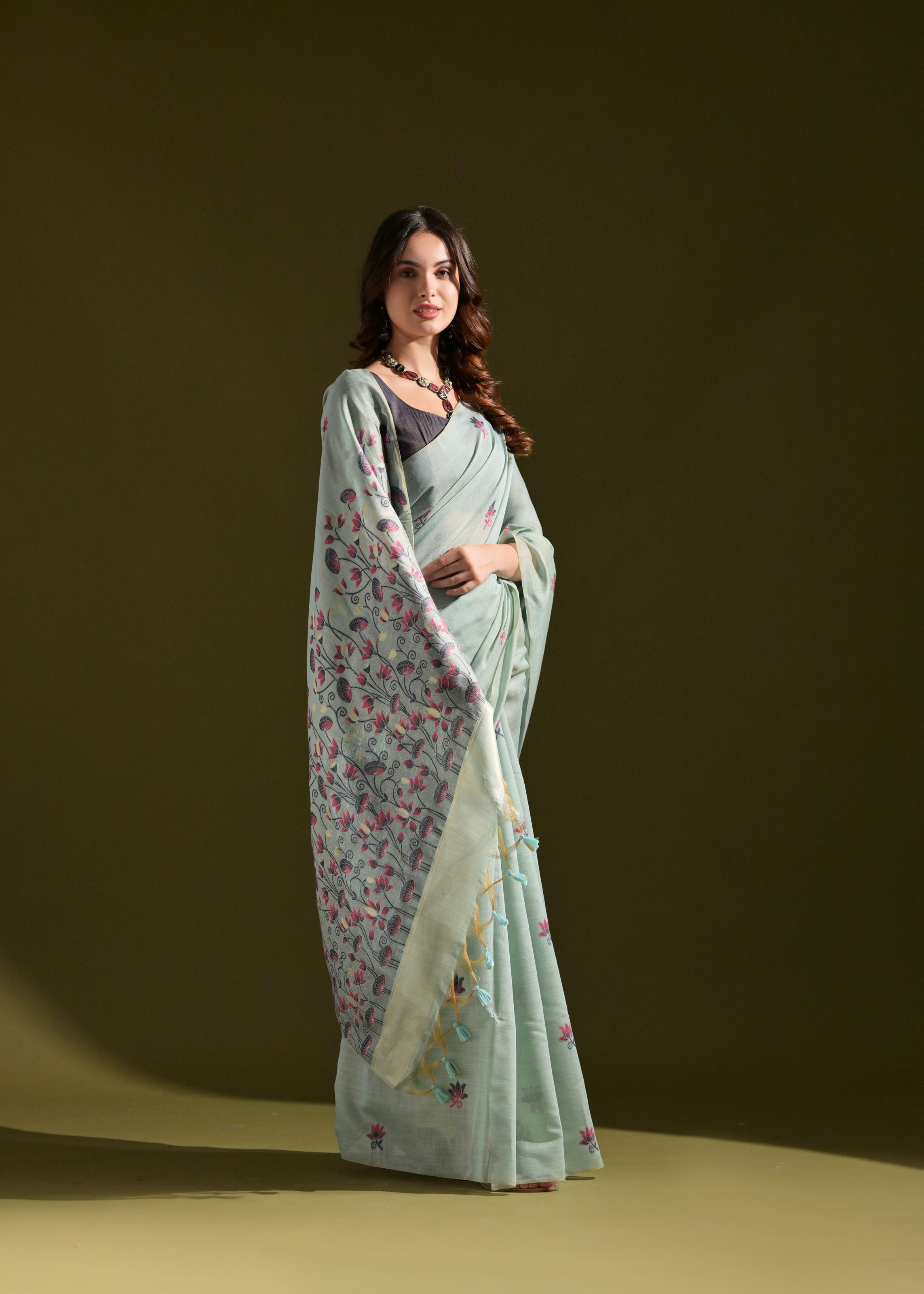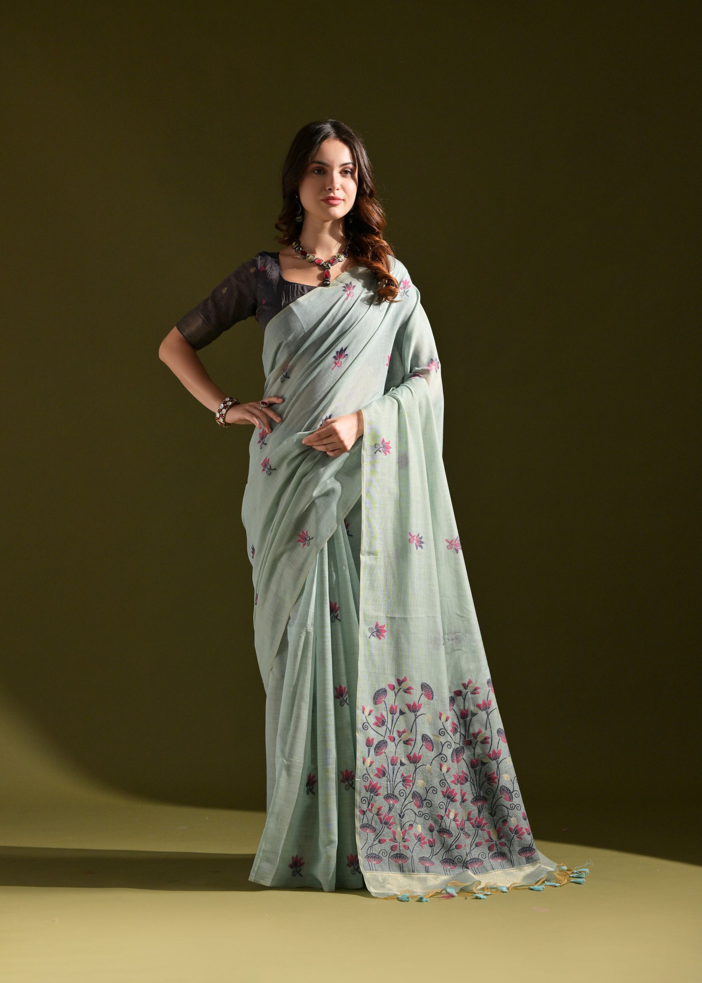 Firozi Muga Cotton Saree with Lotus Thread Design