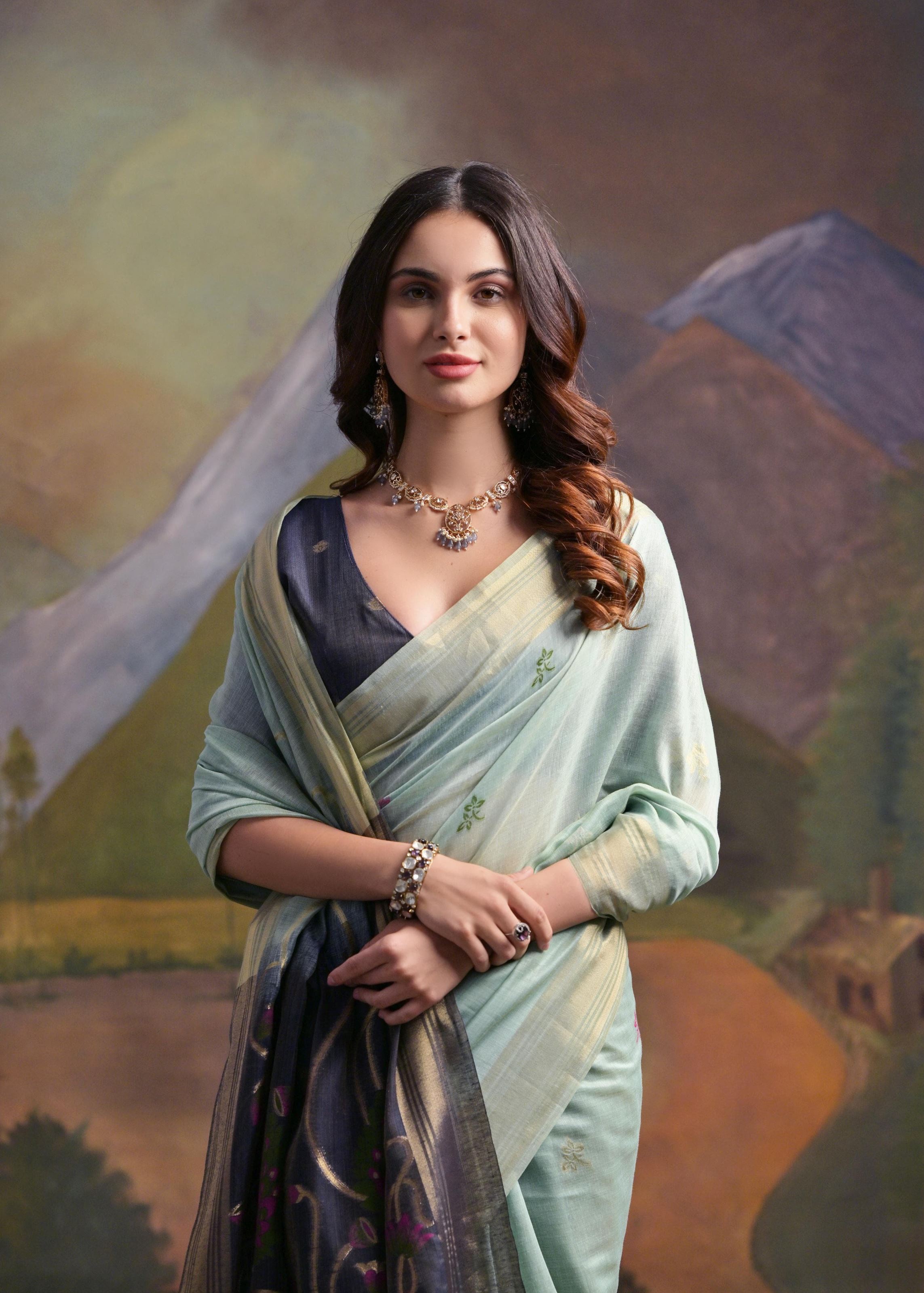 Firozi Muga Cotton Saree with Peacock Pallu and Butti Weaves