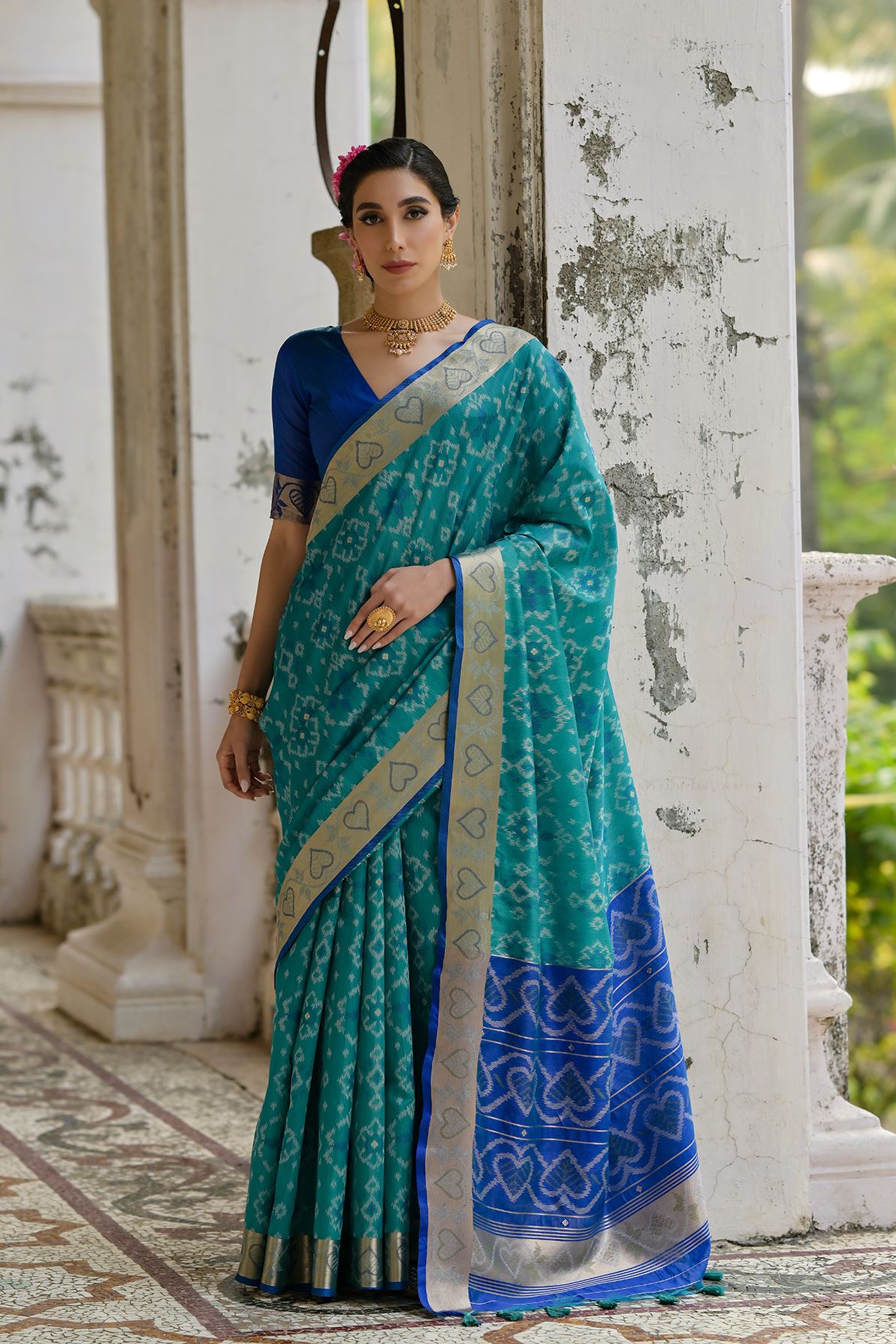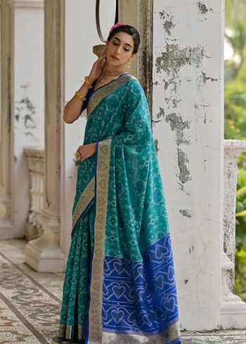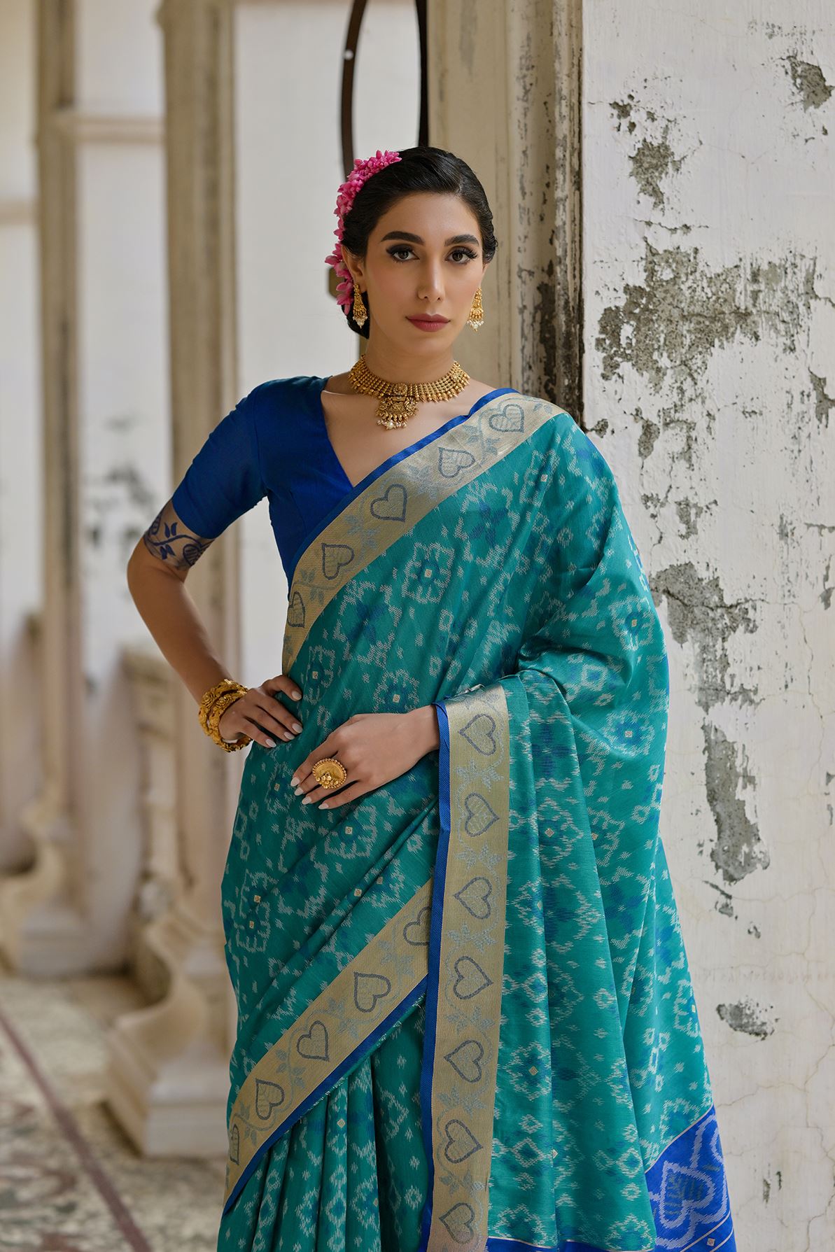 Firozi Raw Silk Saree with Ikkat Design and Contrast Pallu