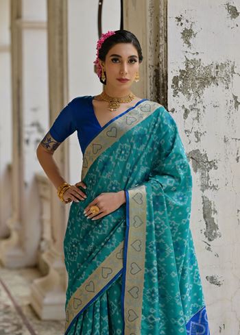 Crafted from premium raw silk, this saree radiates with a refreshing firozi hue, intricately adorned with traditional Ikkat designs that celebrate age-old weaving artistry. The striking royal blue contrast pallu adds a bold and regal flair, beautifully balancing the subtle charm of the body. Accompanied by a royal blue raw silk blouse, it offers a complete, polished ensemble that transitions seamlessly from festive functions to elegant evenings.