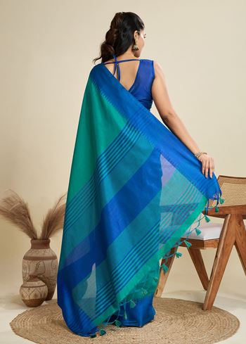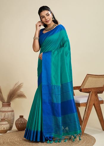 Whether you accessorize with oxidized silver or traditional gold jewelry, the Firozi Raw Silk Saree with Temple Border and Striped Pallu is a refined and graceful choice for the contemporary woman with a love for classic elegance.