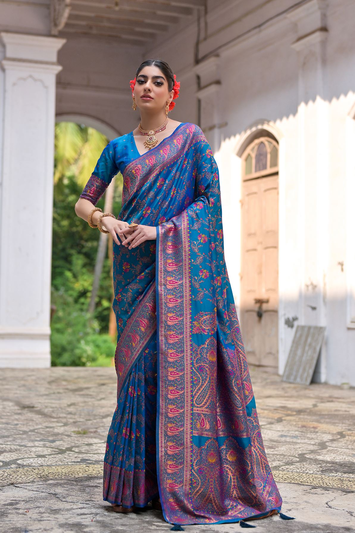 Firozi Silk Saree with Thread Jal and Floral Weaves