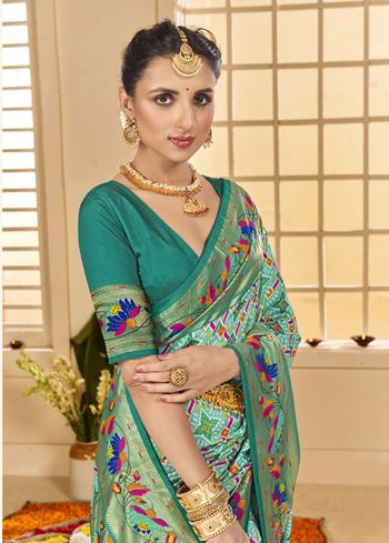 The saree is adorned with a beautifully detailed ikkat-inspired woven border, adding a touch of heritage artistry to its overall design. The serene fountain blue tone reflects sophistication and calmness, while the contrasting green blouse crafted from silk blend fabric completes the look with a striking yet balanced contrast. Together, the colors create a regal palette that enhances the wearer’s presence on any occasion.