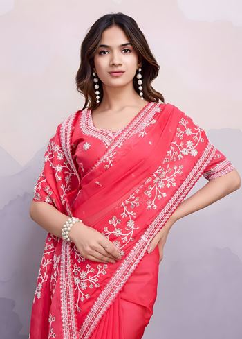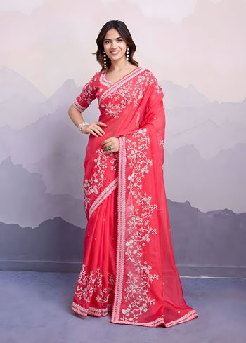 Step into sheer elegance with Aethnofit Fashions’ Gajari Soft Taby Organza Silk Saree, tastefully detailed with delicate embroidery work. The soothing gajari hue (a soft coral-pink) brings a refreshing yet regal touch, perfect for intimate weddings, festive luncheons, or elegant day functions.