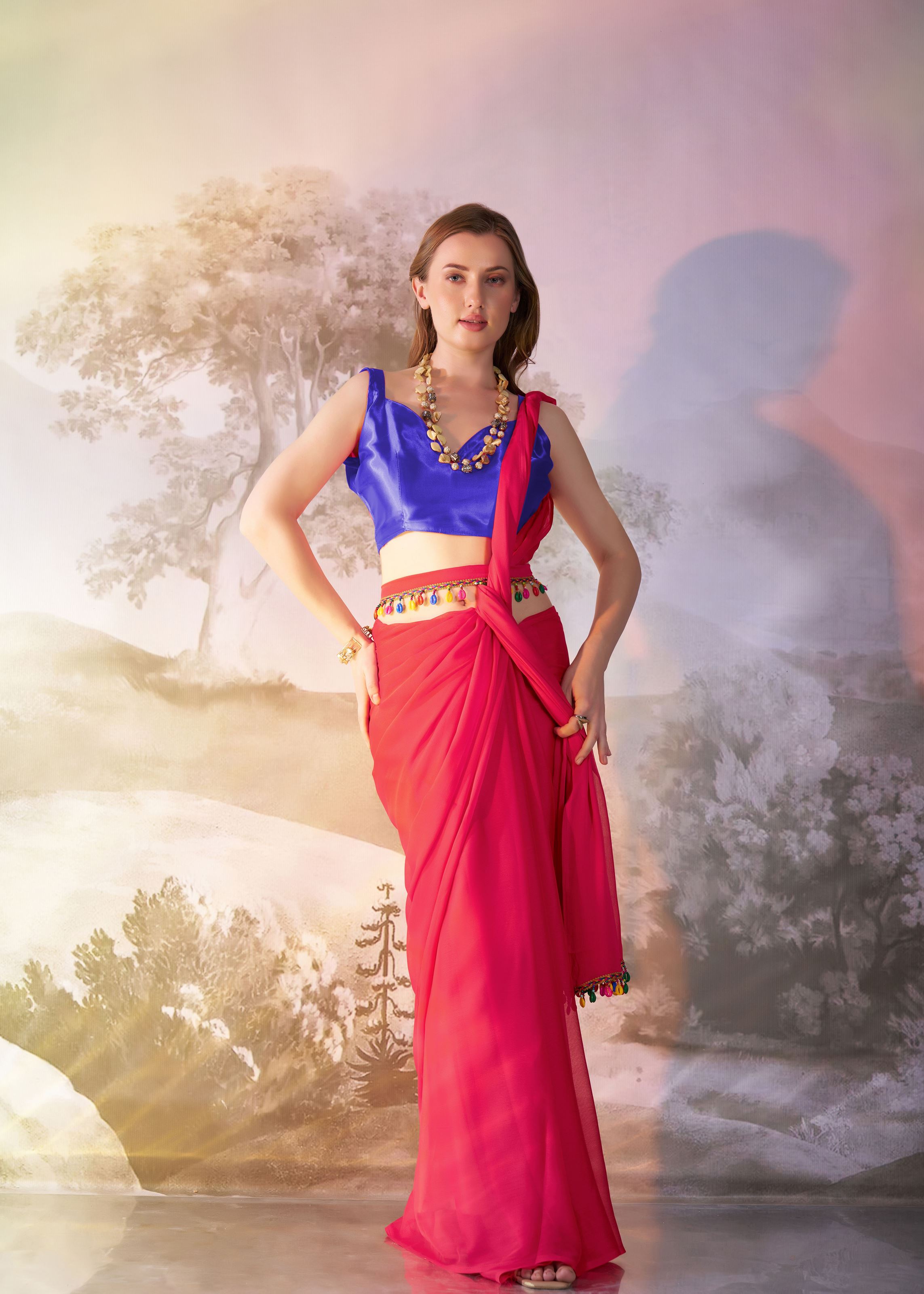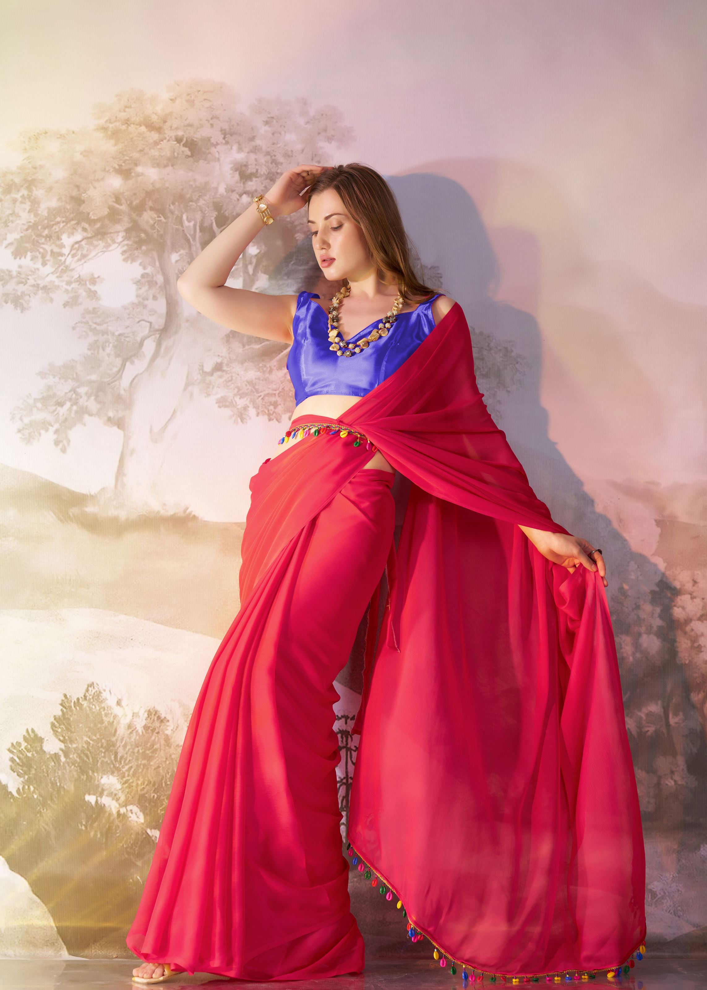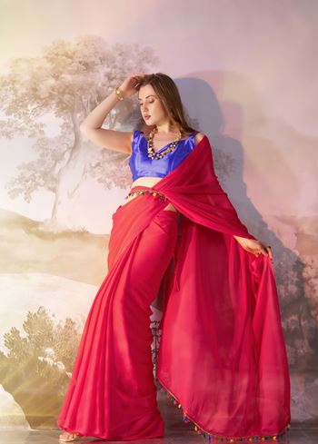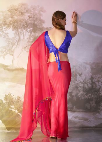 Paired with a contrasting blue art silk blouse, the ensemble achieves a bold and stylish look. The blouse’s smooth texture complements the airy chiffon fabric of the saree, providing comfort without compromising on sophistication. Ideal for women seeking designer sarees online for partywear and premium events, this saree is perfect for evening functions, social gatherings, and festive celebrations, seamlessly merging modern aesthetics with timeless elegance.
