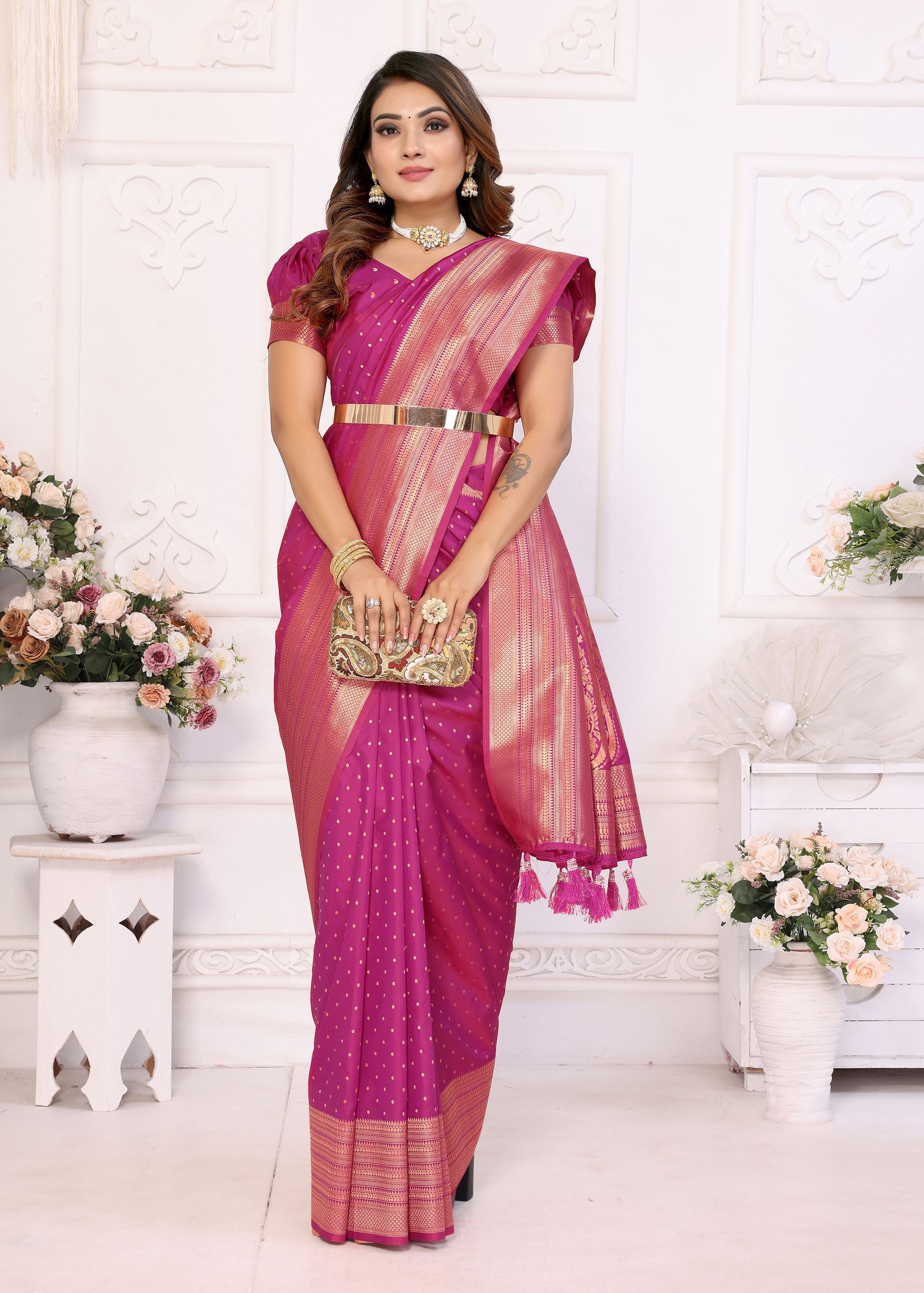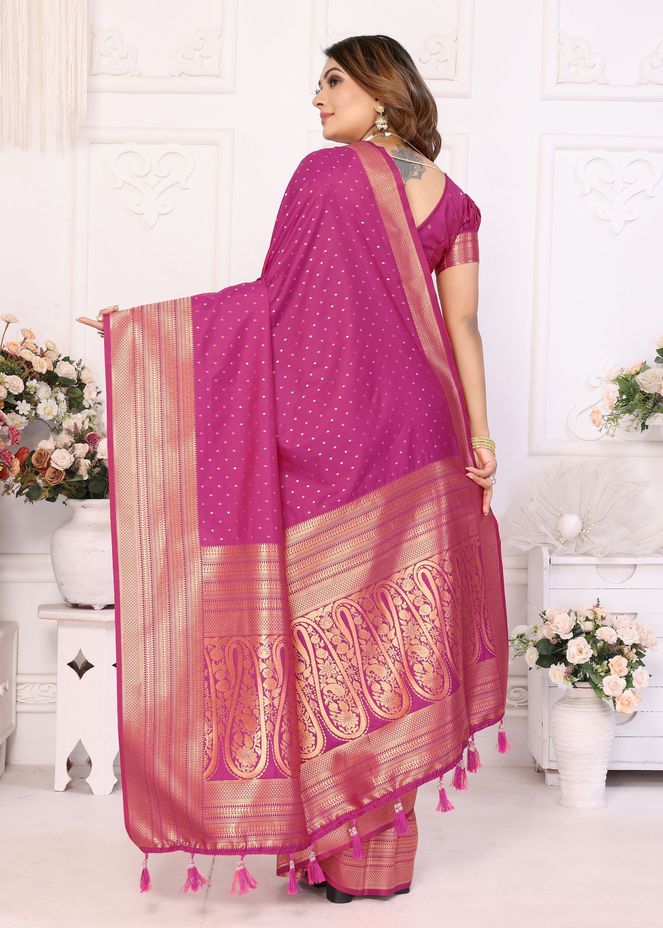 The saree is paired with a matching magenta silk blend blouse, offering a seamless monochrome look that is both elegant and timeless. This refined combination makes it versatile enough to be styled in multiple ways—whether with heritage jewelry for a classic festive ensemble or minimalist accessories for a chic modern look. Its woven detailing adds depth, making it a standout piece in every collection.