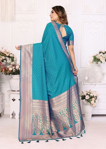 The saree is paired with a matching teal blue silk blend blouse, maintaining a seamless tone-on-tone appeal. This monochrome elegance highlights the intricate woven work, making it versatile enough to style with both statement jewelry for a traditional touch or minimalist accessories for a chic, modern vibe. It is designed for women who appreciate the balance of heritage craftsmanship with contemporary fashion.