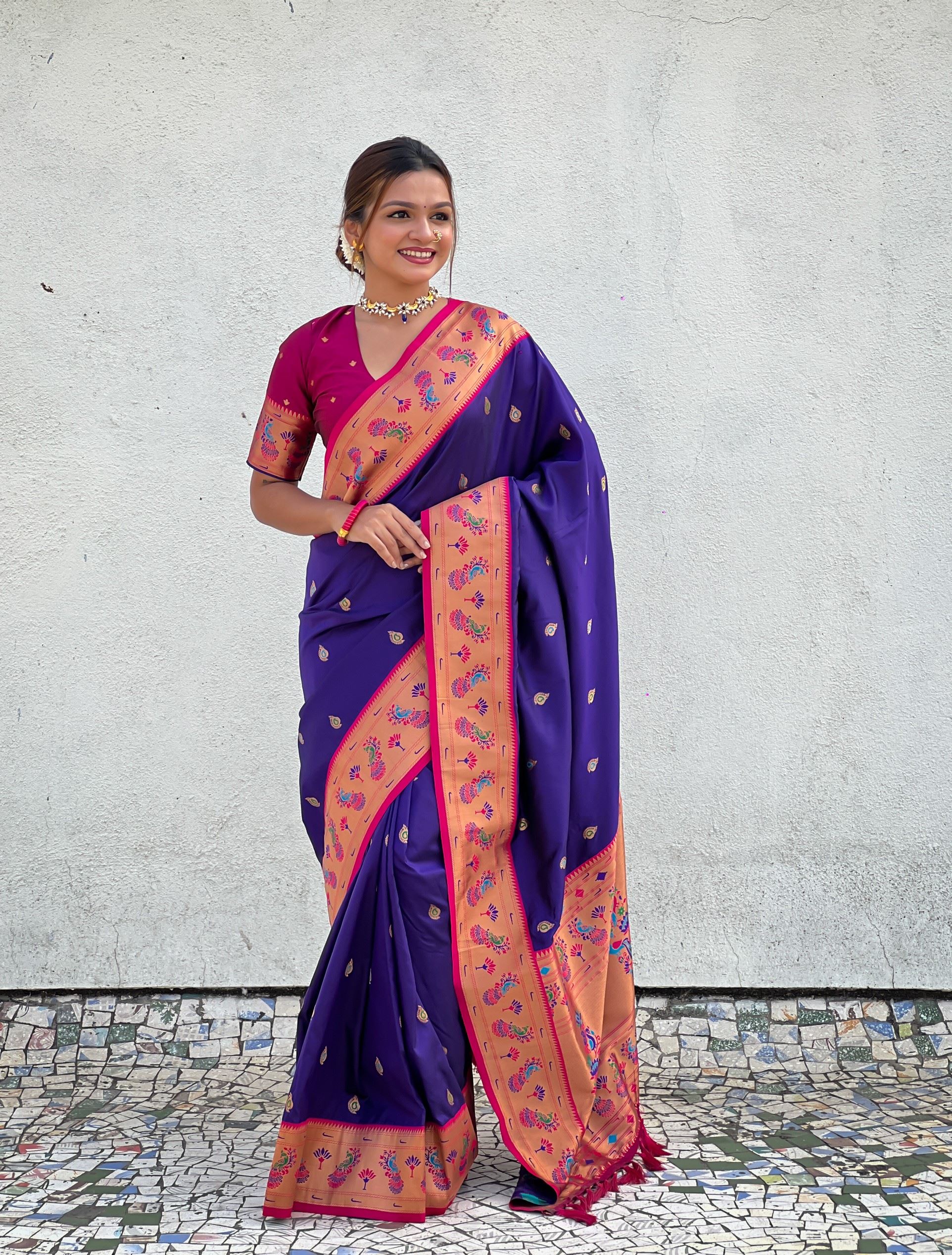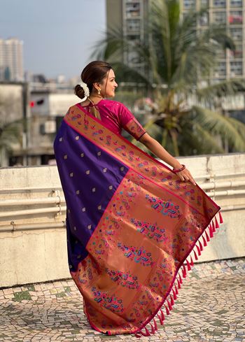 This designer saree features intricate Meenakari weaving, highlighting expert craftsmanship and traditional artistry. The magenta art silk blouse complements the lavender saree, creating a harmonious and visually appealing ensemble. Each detail has been thoughtfully designed to combine ethnic elegance with contemporary design, making it an ideal choice for women seeking designer partywear that stands out.