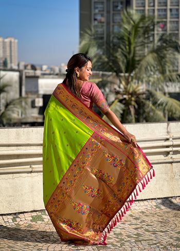 The saree showcases intricate Meenakari weaving, highlighting meticulous craftsmanship and traditional artistry. The pink art silk blouse complements the parrot green saree beautifully, forming a harmonious and stylish look. Each detail is thoughtfully designed to blend ethnic charm with contemporary fashion, making it an ideal choice for women seeking designer partywear with festive flair.
