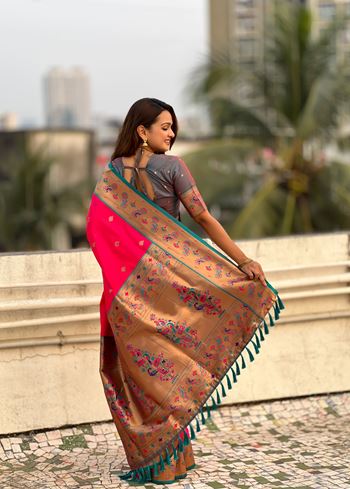 Featuring intricate Meenakari weaving, this designer saree highlights exceptional craftsmanship and traditional artistry. The green art silk blouse complements the red saree beautifully, forming a balanced and eye-catching ensemble. Each element is thoughtfully designed to merge ethnic elegance with contemporary style, making this saree an ideal choice for women seeking designer festive wear.