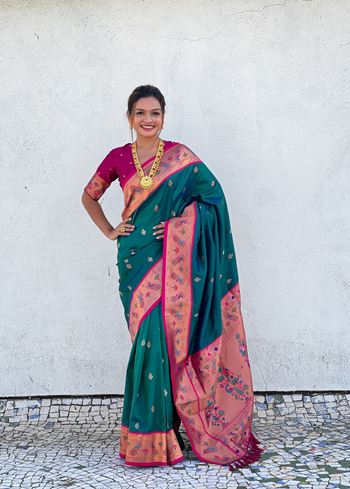 This saree features intricate Meenakari weaving, showcasing fine craftsmanship and traditional artistry. The pink art silk blouse complements the teal blue saree beautifully, forming a harmonious and stylish ensemble. Each detail highlights a blend of ethnic elegance and contemporary fashion, making it an ideal choice for festive or ceremonial occasions.