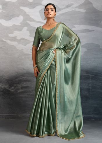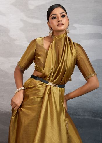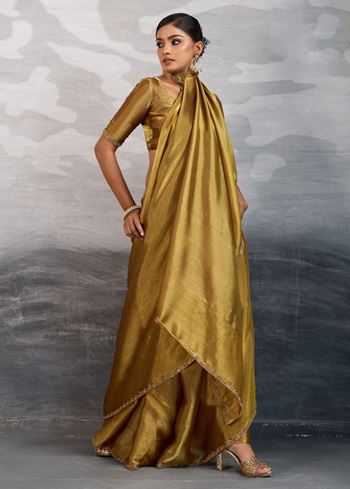 Shimmer with elegance in this Golden Burberry Chiffon Saree, embellished with delicate beadwork and shimmering Cutdana lace. Designed to reflect grace and modern glamour, this saree is crafted from high-quality Burberry Chiffon that flows effortlessly, offering a soft, luxurious drape. The radiant golden tone, paired with handcrafted detailing, makes it a perfect choice for cocktail nights, sangeet, or reception wear.