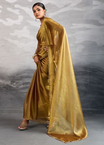 Golden Burberry Chiffon Saree with Beads and Cutdana Lace