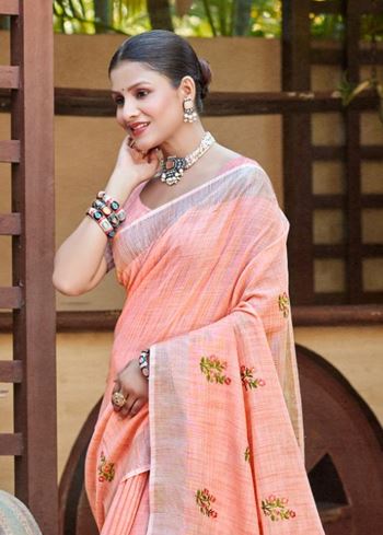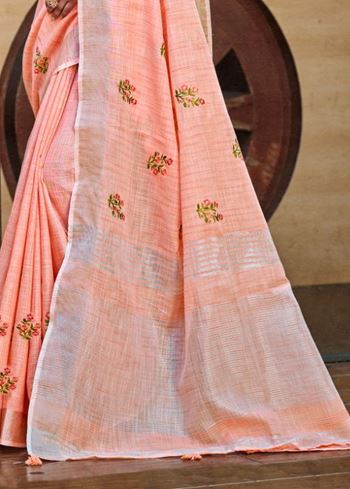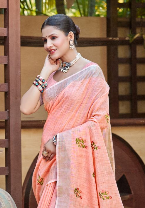 The matching peach linen blouse enhances the saree’s cohesive appeal, giving you the freedom to style it in countless ways. Opt for delicate pearl jewellery for a subtle, refined look, or choose vibrant statement accessories to add a modern edge. The saree’s versatile charm ensures it transitions effortlessly from a daytime celebration to an evening festivity.Perfect for those who wish to shop sarees online in premium fabrics, discover designer styles, or add to their collection of wedding and party wear sarees, this piece is a true wardrobe treasure. Part of our best saree collection featuring silk, cotton, bridal, and more, it comes with worldwide delivery. For customers in the USA and beyond, Aethnofit Fashions ensures quick shipping and unmatched quality in every piece.