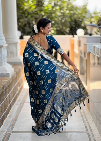 Enhance your ethnic wardrobe with this Teal Blue Dola Silk Saree, a perfect blend of elegance and heritage craftsmanship. Crafted from premium silk blend fabric, this saree offers a soft, luxurious drape that enhances your traditional look for festive and wedding occasions.