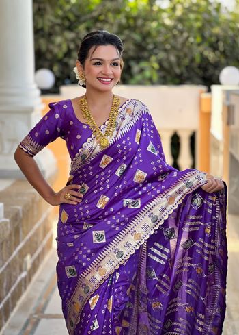 The saree features an exquisite Meenakari woven design, showcasing intricate craftsmanship inspired by royal traditions. The stunning violet color adds a majestic charm, making it perfect for weddings, festive celebrations, parties, and cultural events. Accompanied by a matching silk blend blouse in the same rich hue, this ensemble ensures a coordinated and stylish appearance.