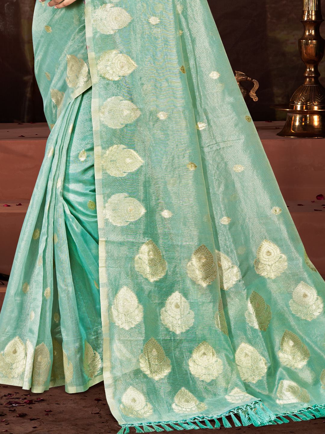 The matching sea green Munga Kota blouse completes the look, giving you the freedom to style it for various occasions. Pair it with antique gold jewellery for a rich ethnic appearance, or choose silver and pearl accents for a softer, elegant vibe. With its graceful fall and exquisite finish, this saree transitions beautifully from daytime celebrations to evening festivities.