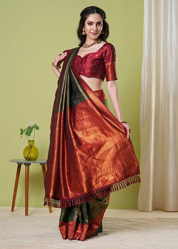 Elevate your ethnic wardrobe with the Green Banarasi Silk Saree With Beautiful Jacquard Designer Work from Aethnofit Fashions. Crafted from premium silk, this saree showcases exquisite jacquard weaving, reflecting the rich tradition of Banarasi craftsmanship. The vibrant green hue paired with a contrasting maroon silk blouse creates a striking, elegant look perfect for weddings, festive celebrations, and special occasions.