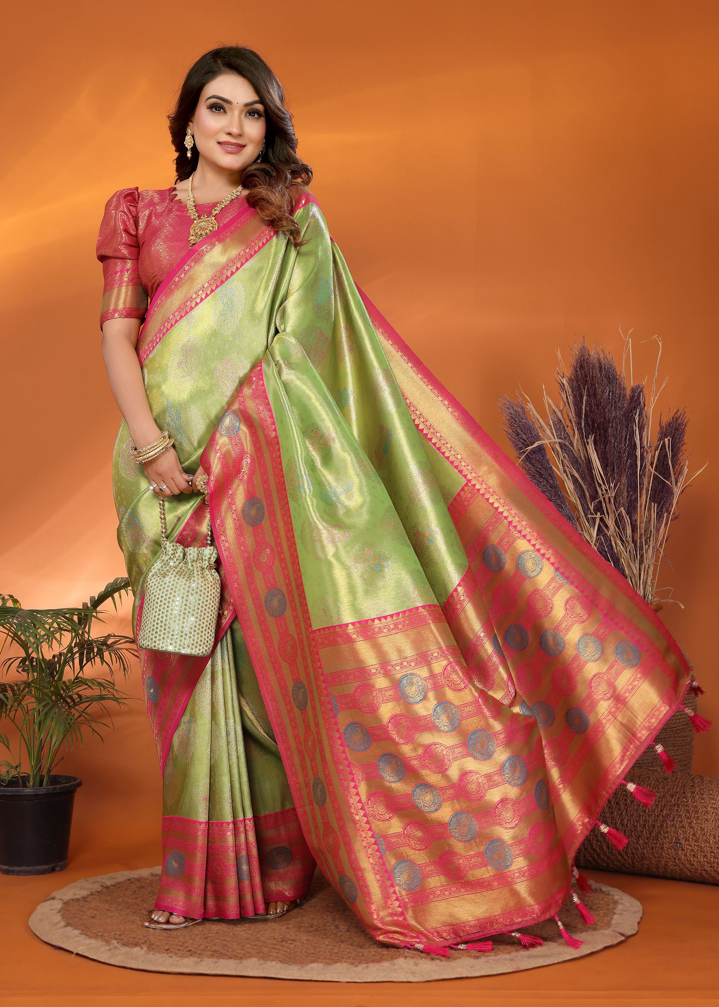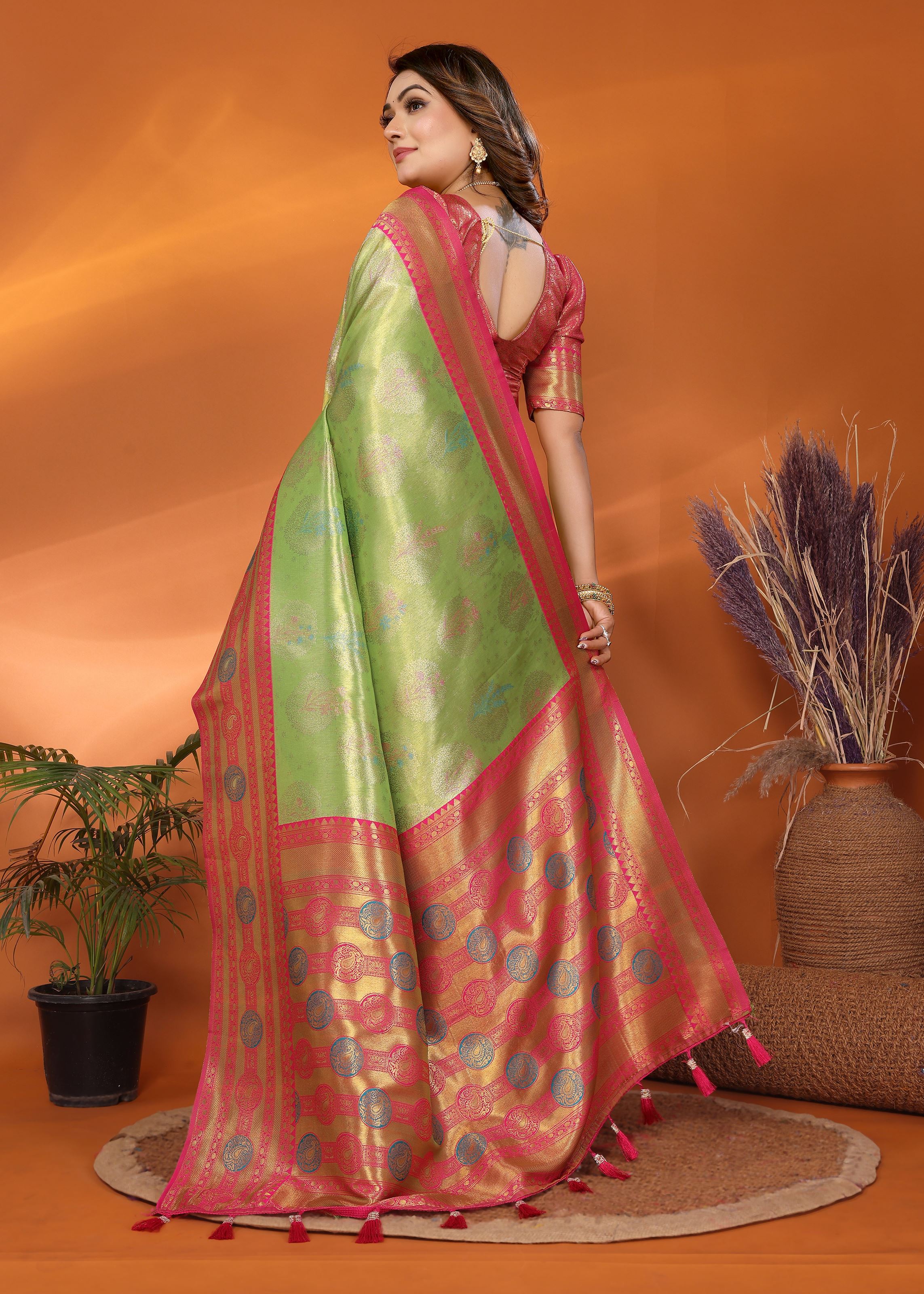 Green Banarasi Tissue Silk Saree With Woven Paithani Designer