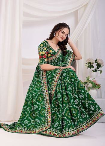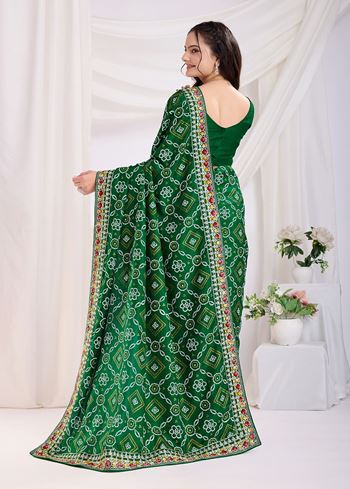 Green Bandhani Printed with Embroidery Work Beautiful Ceremonial Saree