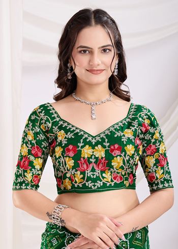 Adorned with classic Bandhani prints, this saree reflects the timeless artistry of Indian heritage, while the delicate embroidery work enhances its beauty with a touch of sophistication. The combination of traditional patterns and fine embellishments ensures that the saree carries a festive aura, perfect for ceremonial wear. Paired with a matching green art silk blouse, it creates a graceful and coordinated ensemble, giving you a complete ethnic look.