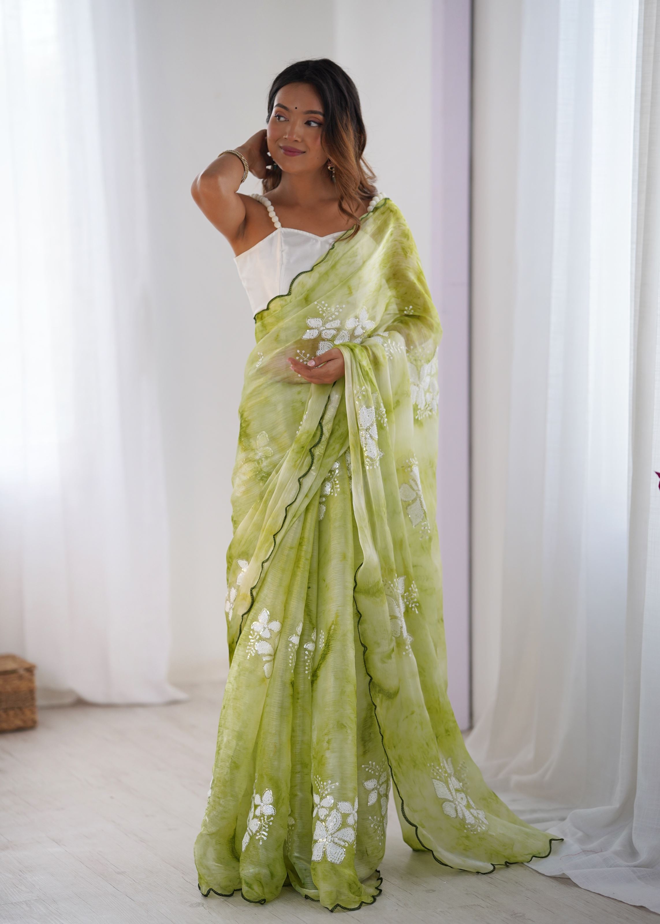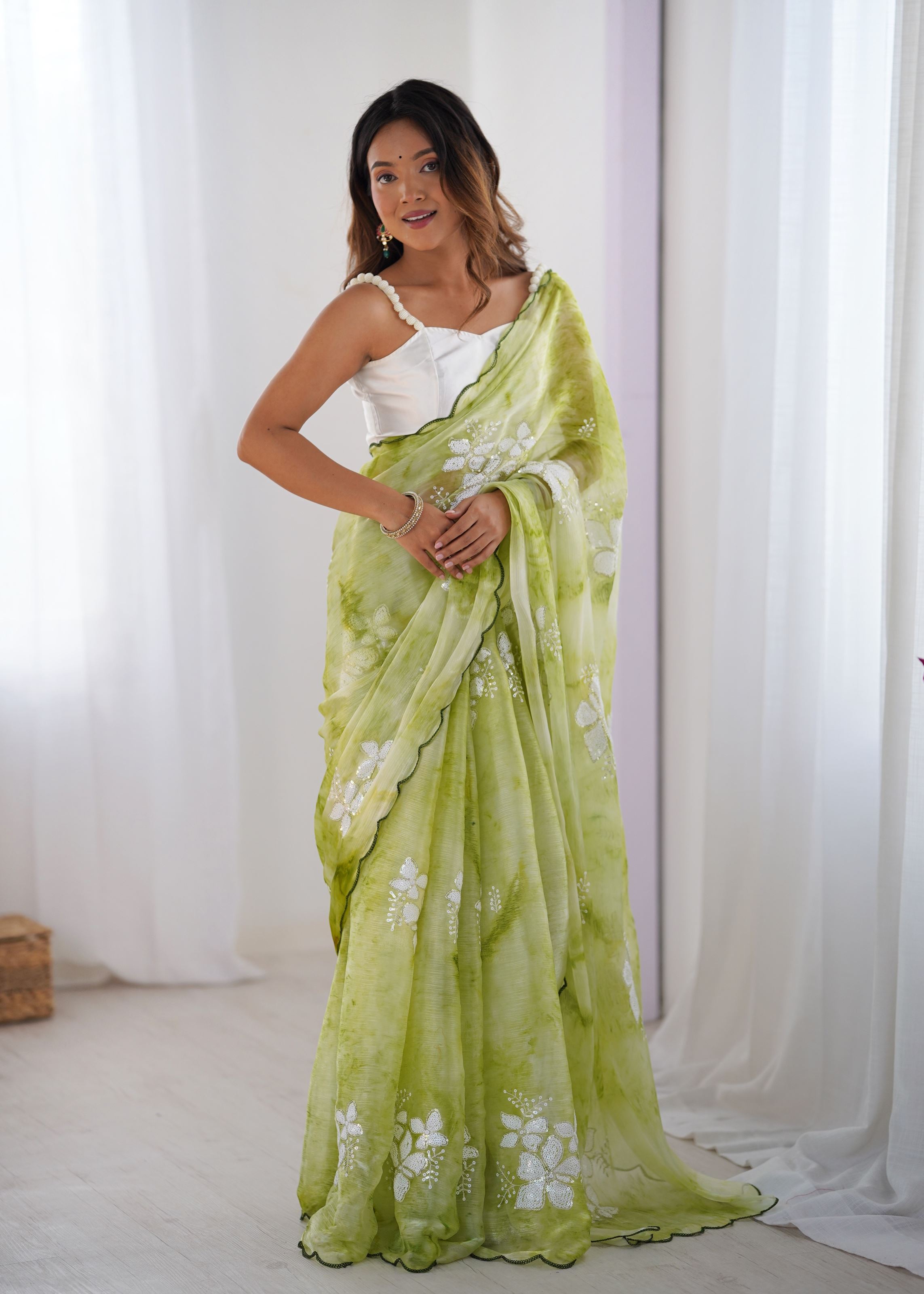 Paired with a chic white art silk blouse, this combination creates a balanced and fashionable contrast. The blouse fabric is soft and luxurious, complementing the saree’s airy texture while enhancing your overall style quotient.Ideal for women who love designer-inspired outfits, this saree can be styled with statement earrings, high heels, and a trendy clutch for a show-stopping look. Whether you’re attending an engagement, sangeet, or festive evening, this green chiffon embroidered saree will make you the center of admiration.