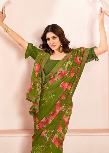 The enchanting green shade reflects freshness and prosperity, while the digital printed patterns lend a contemporary flair, ensuring you stand out in every crowd. The prints are crafted with precision, offering a vibrant yet sophisticated look that balances tradition with modern aesthetics. Paired with a matching green faux georgette blouse, the ensemble exudes effortless harmony and refined style.