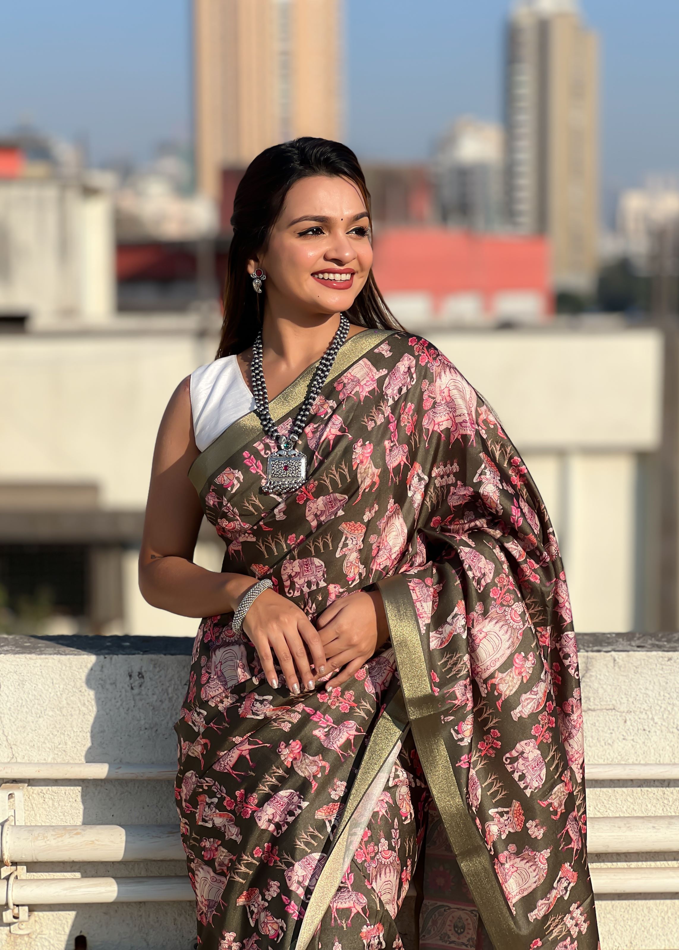 Elevate your ethnic wardrobe with the Green Classic Tussar Silk Saree With Woven And Designer Print Work, exclusively from Aethnofit Fashions. Made from premium tussar silk, this saree combines luxurious comfort with timeless elegance, making it perfect for weddings, festive occasions, parties, and formal gatherings. The rich green shade adds a vibrant and sophisticated touch, while the intricate woven patterns and designer print work showcase exceptional craftsmanship, offering a perfect blend of tradition and contemporary style.