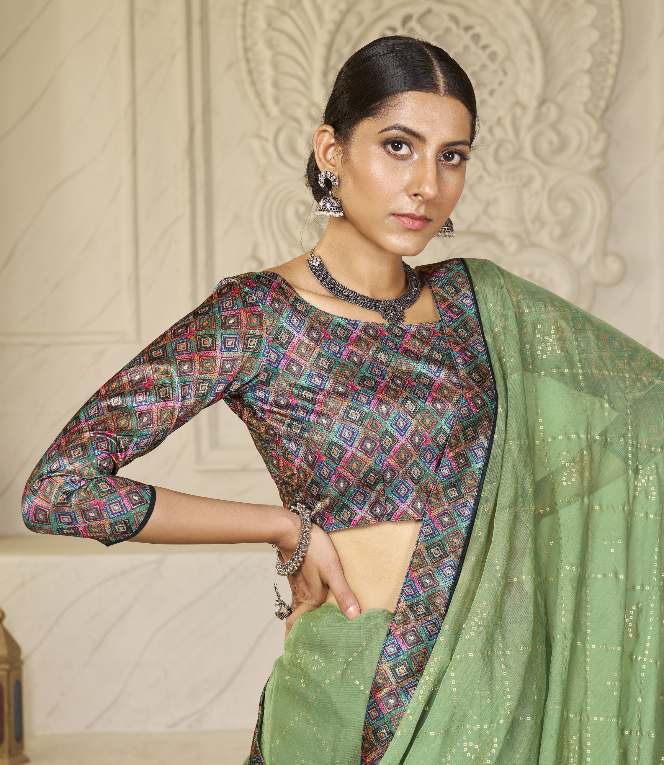 Designed to complement every body type, the saree effortlessly enhances your silhouette with its fluid fall and graceful pleats. It comes paired with a matching green chiffon blouse, allowing you to experiment with traditional or modern blouse styles according to the occasion.