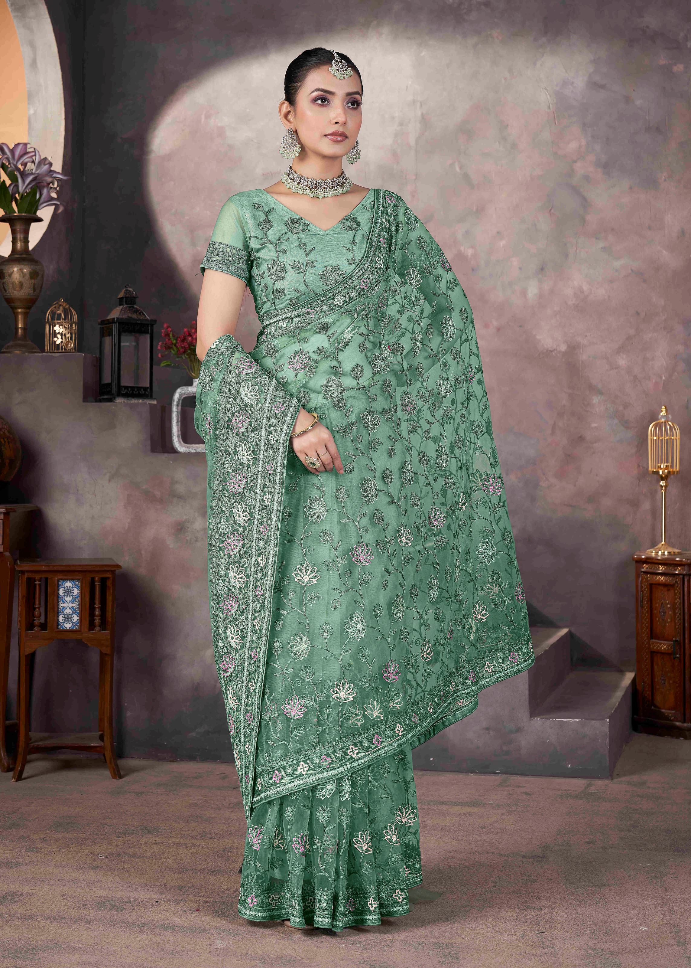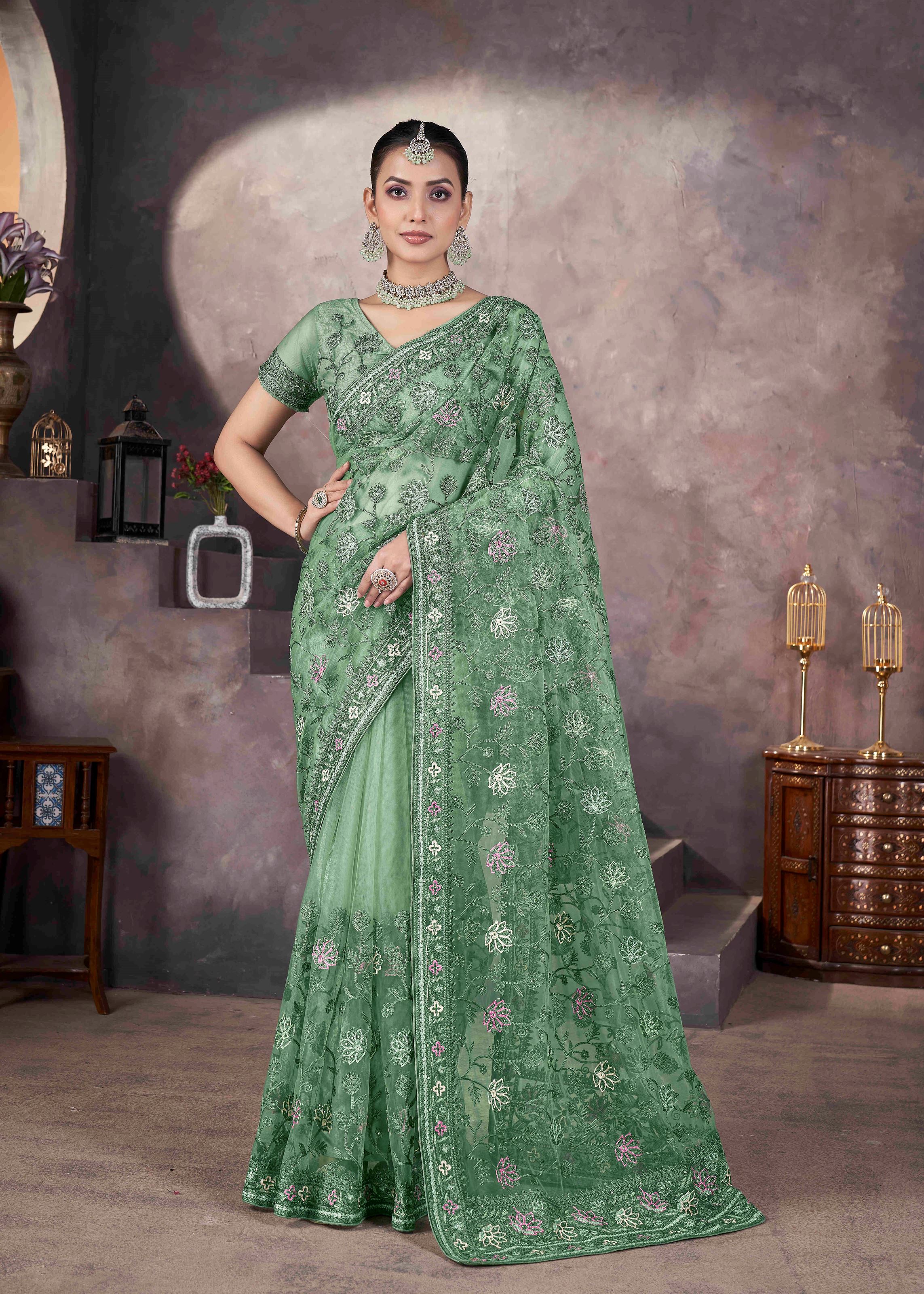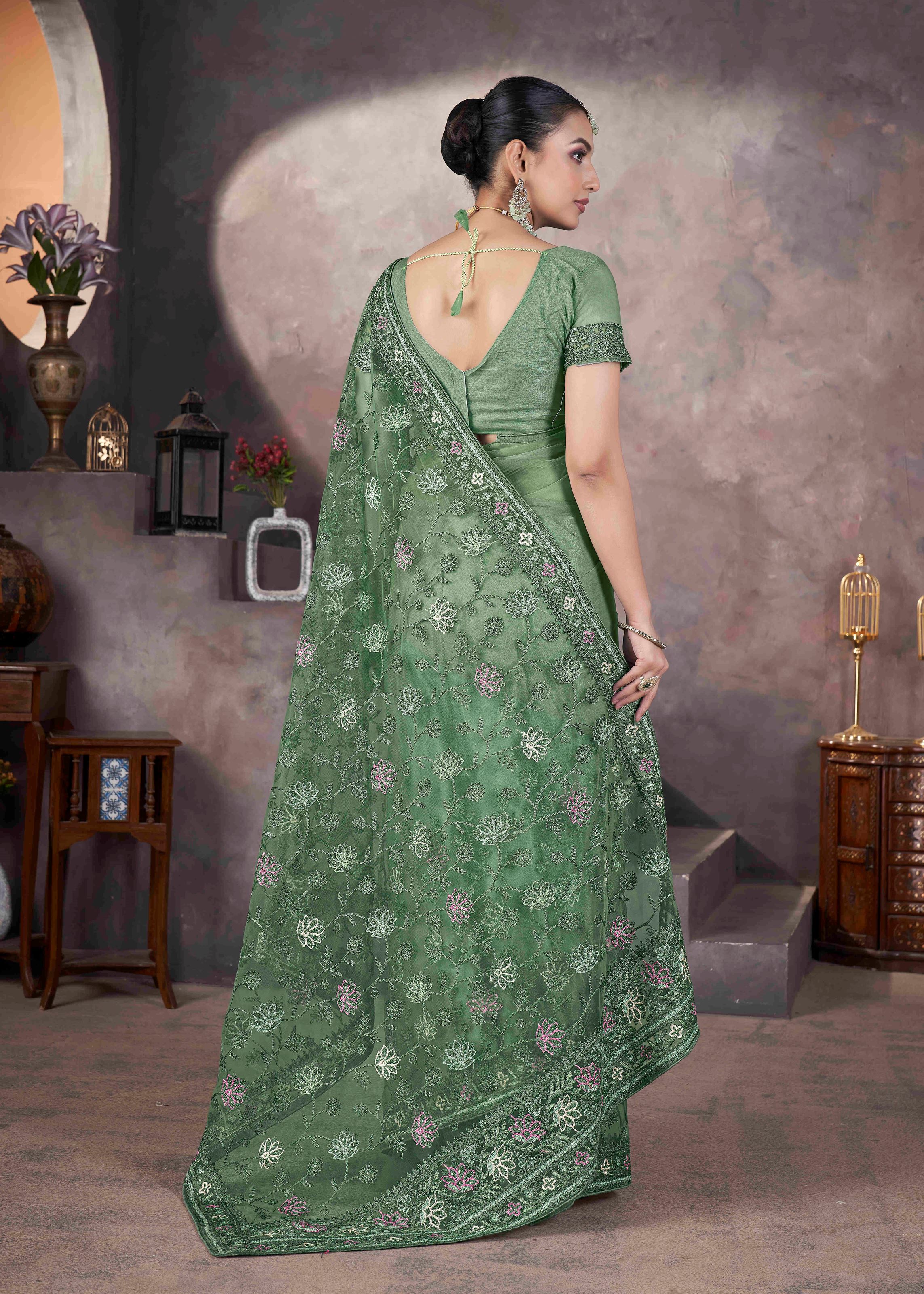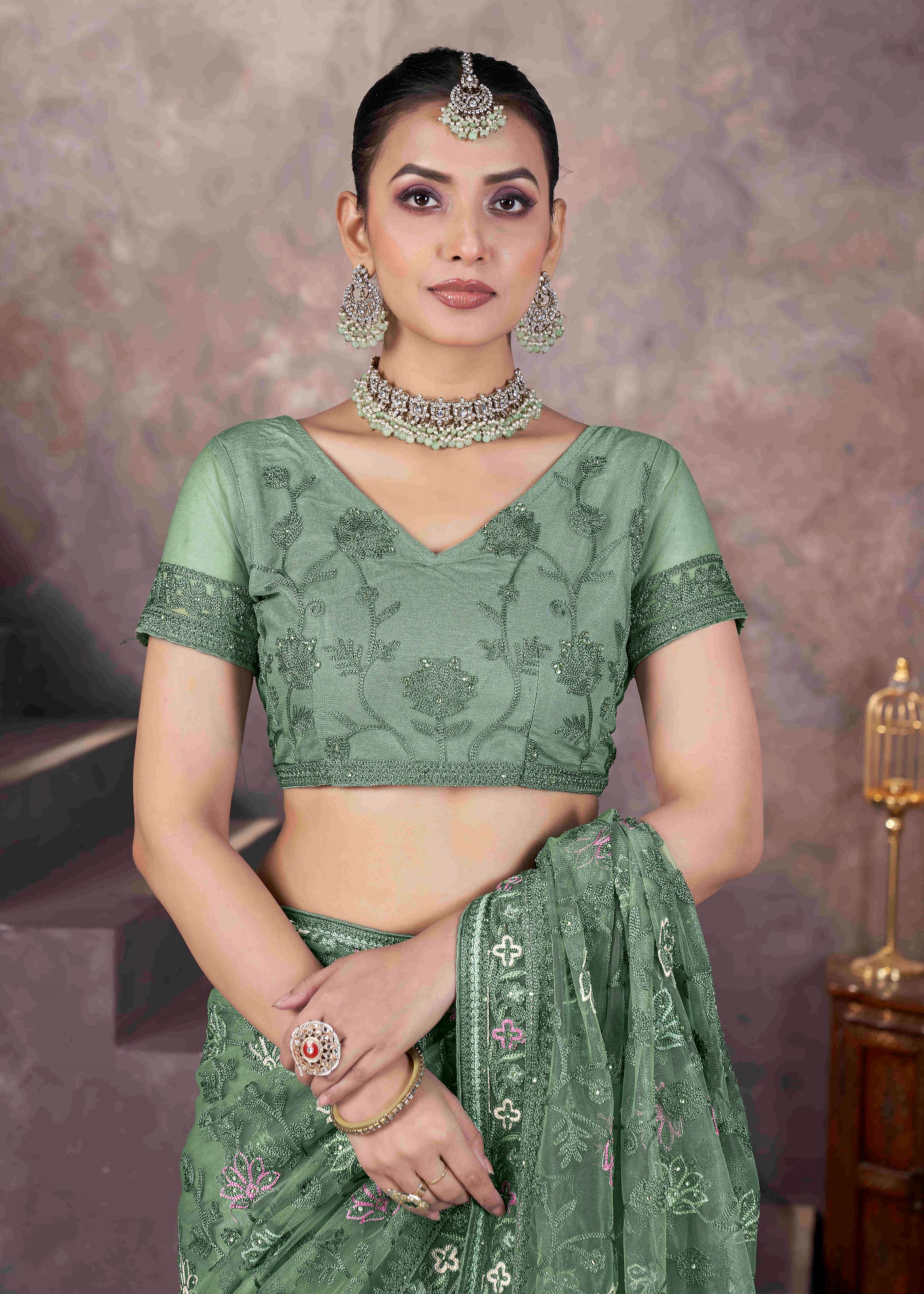 It comes with a matching net blouse in green color, complementing the overall look and enhancing its designer appeal. Pair this exquisite saree with traditional jewelry, a sleek hairstyle, and elegant footwear for a complete ceremonial look.Whether you want to make a statement at a family function or steal the spotlight at a festive celebration, this green butterfly net embroidered saree is your go-to option. It blends traditional aesthetics with a contemporary edge, making it an irresistible addition to your ethnic collection.