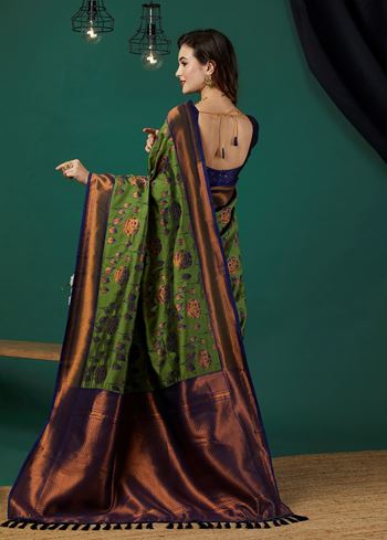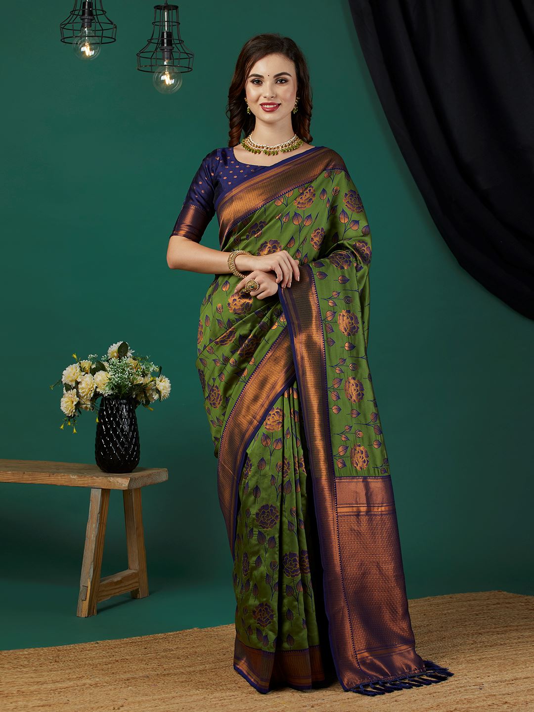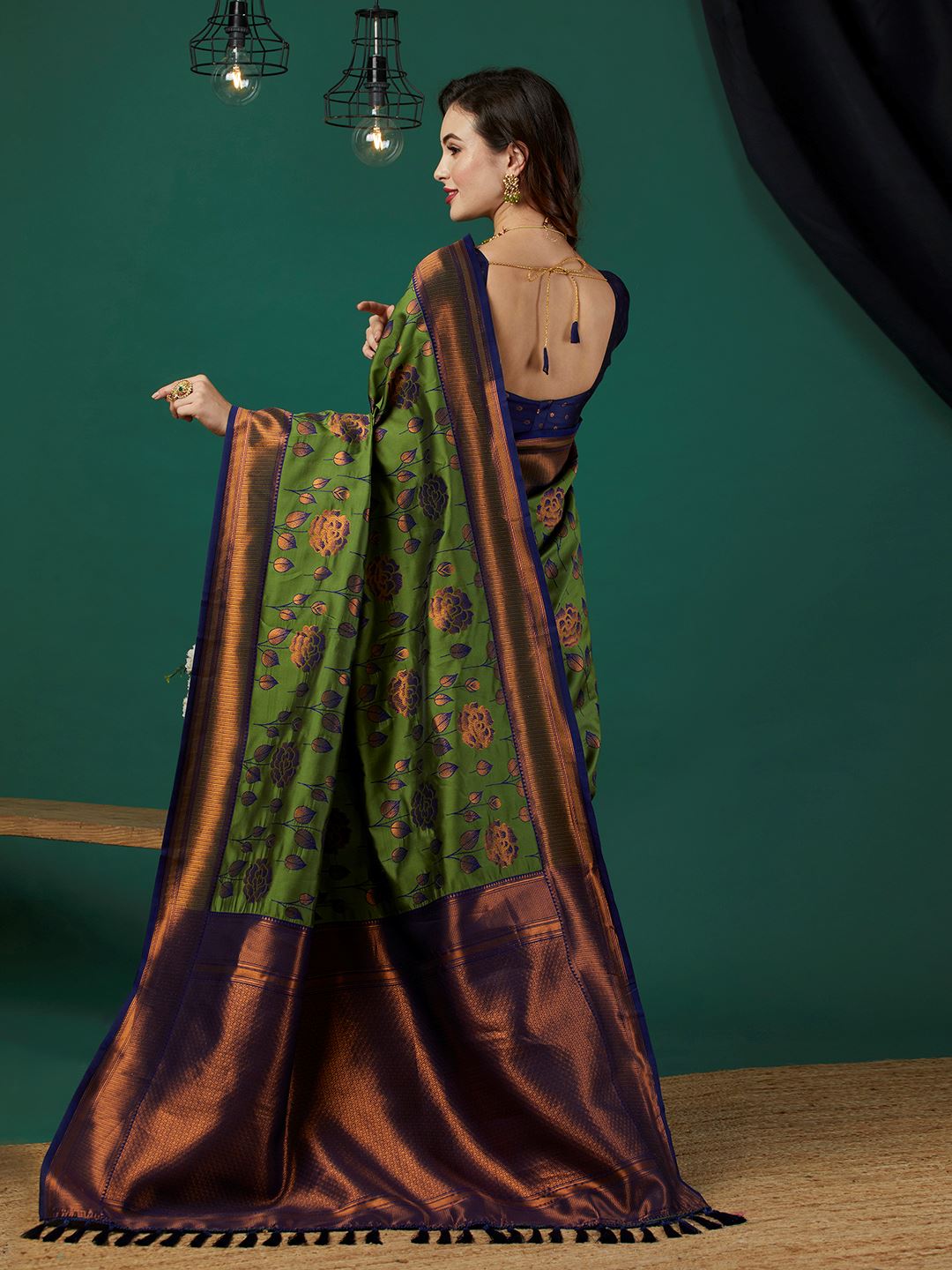 Green Ethnic Banarasi Silk Saree With Floral Woven Designer Looks