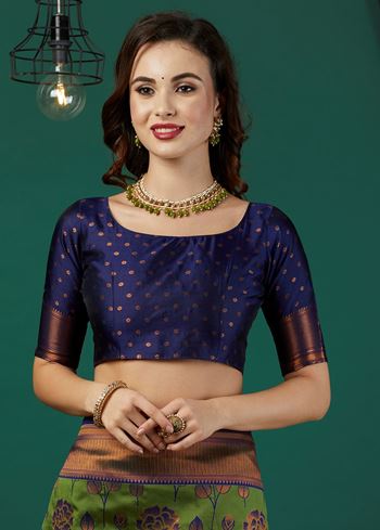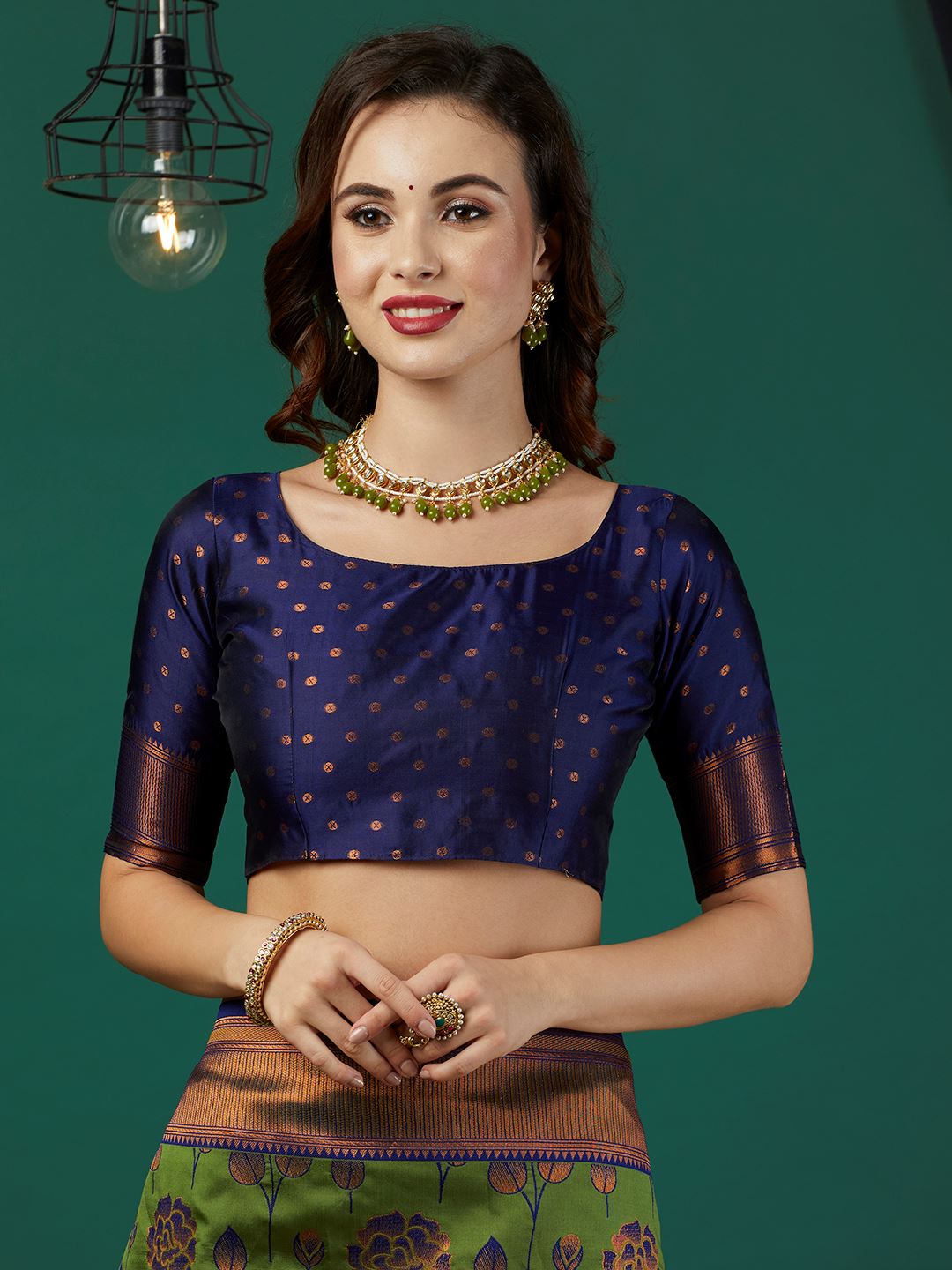 This saree is paired with a striking blue silk blouse, adding a perfect contrasting highlight to the lush green drape. The fine woven artistry enhances its regal appeal, showcasing the brilliance of traditional weaving techniques. Lightweight yet opulent, this Banarasi saree allows you to carry yourself with sophistication, whether styled in a classic traditional drape or a modern chic look.