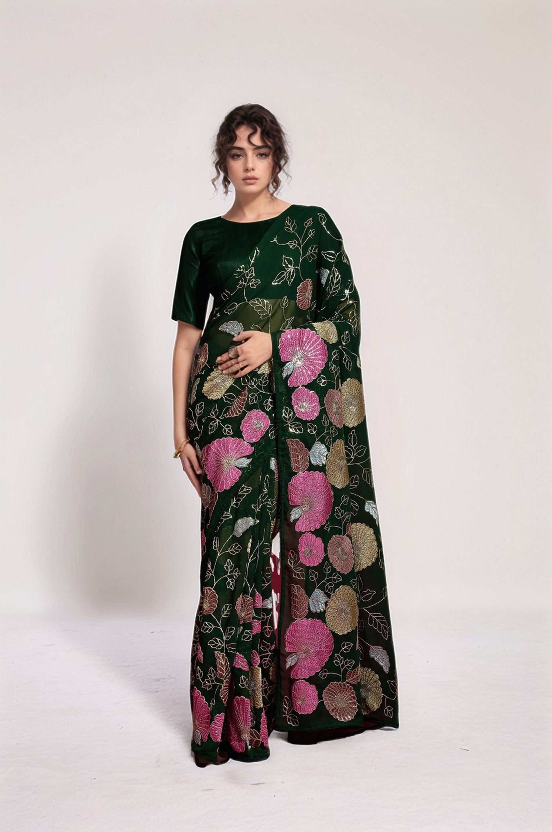 Designed with exquisite sequin and embroidery detailing, this Bollywood-inspired saree captures the essence of glamour and sophistication. It comes paired with a matching green art silk blouse, giving you the ideal combination of tradition and modern style.