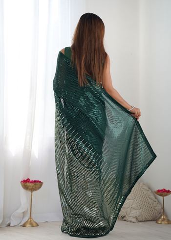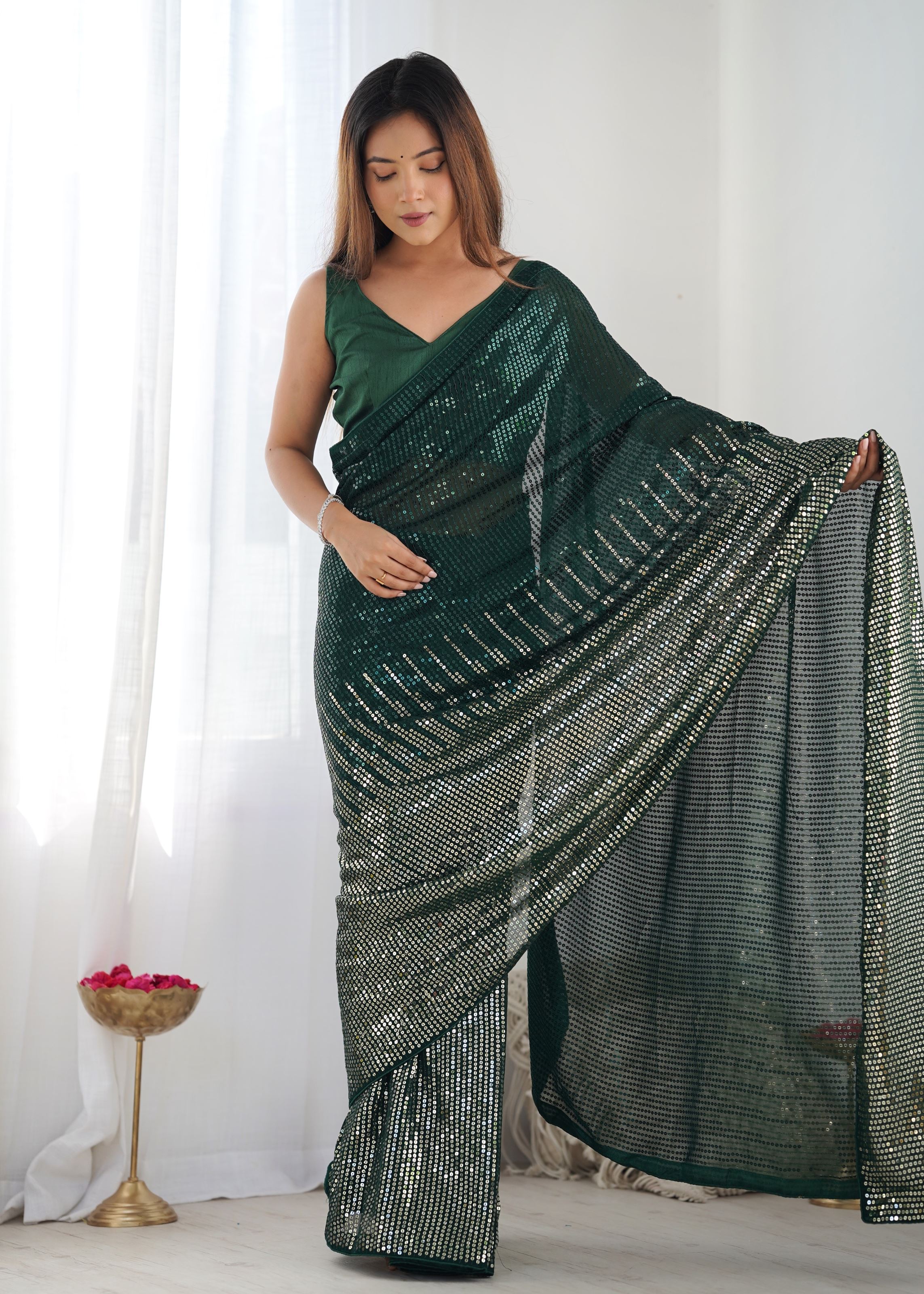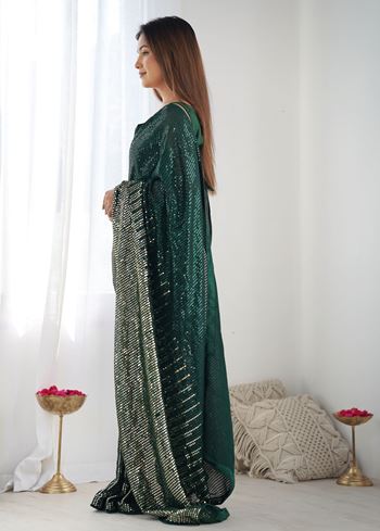 Green Georgette Designer Sequins Embroidery Work Bollywood Style Partywear Saree